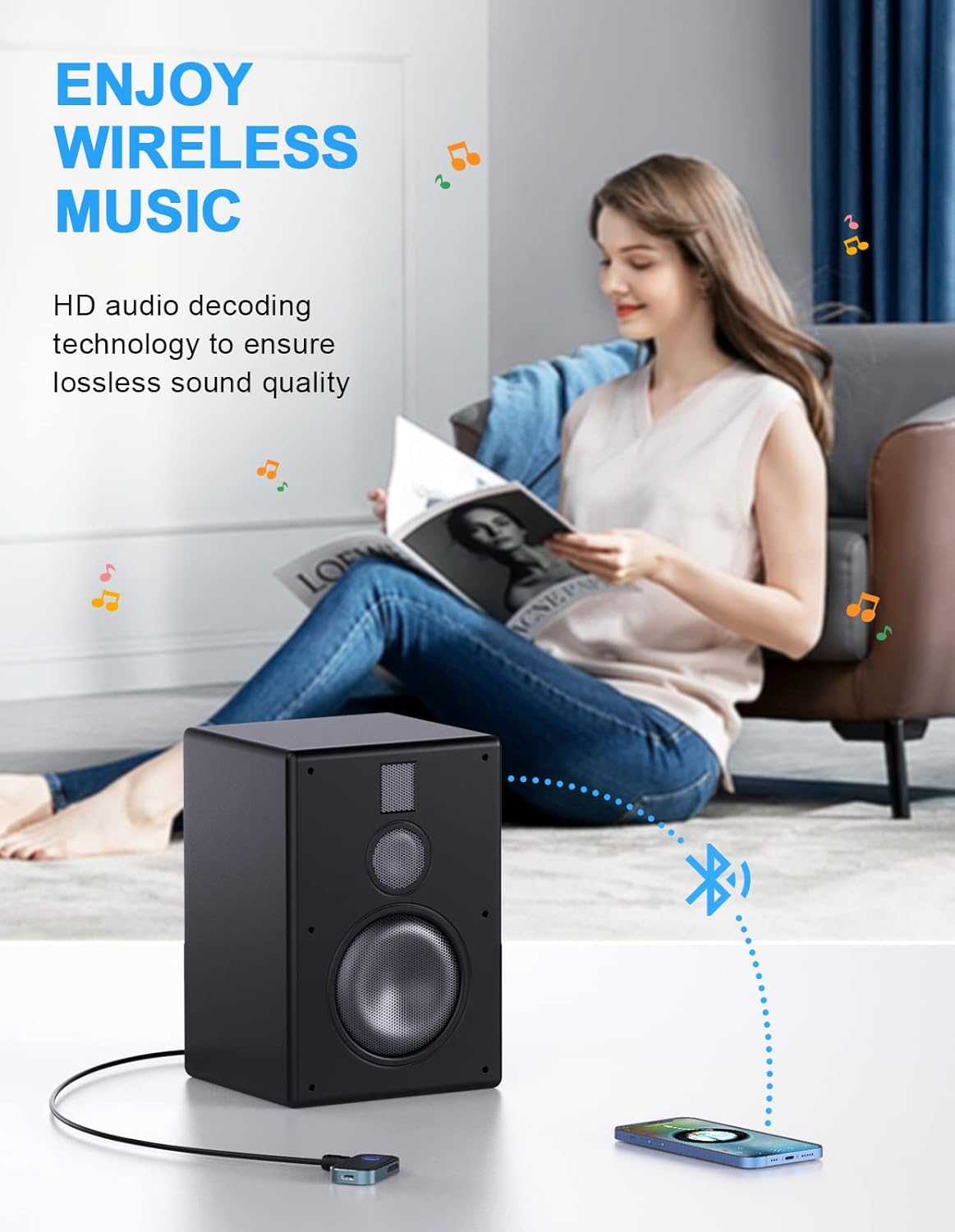 【Enjoy Wireless Music Streaming】Via the 3.5mm AUX adapter, this Bluetooth receiver can connect to non-Bluetooth car audio system, home stereo, speaker, and wired headphone; Equipped with an advanced Bluetooth 5.0 chip, it has stable connection, fast transmission, and wide signal range. Pair your phone and start your musical journey!