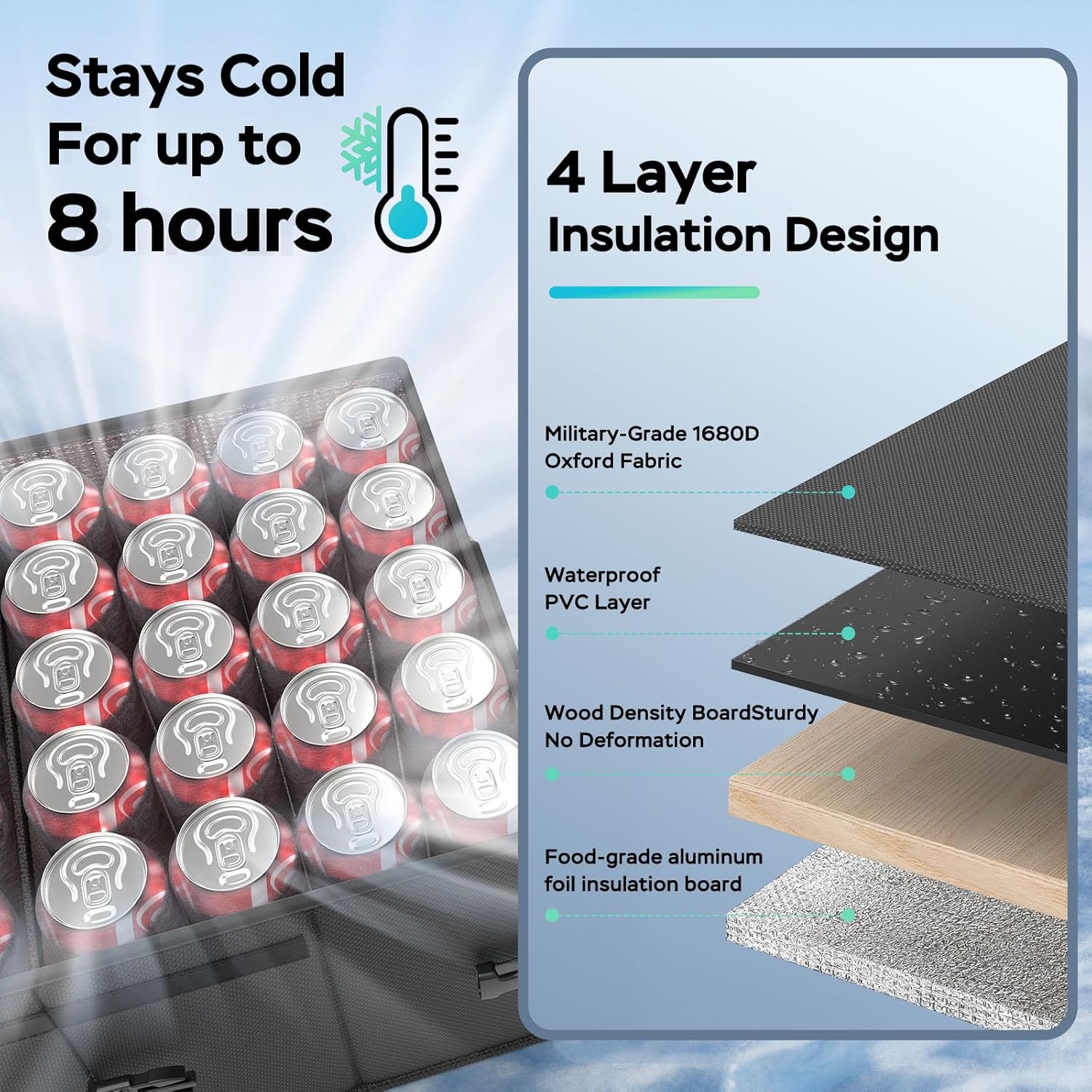 【Reinforced Structure – Stays Upright, Stays Clean】 Built with dense, supportive wood panels, this cooler won’t collapse, tip, or lose its shape like ordinary soft coolers. It also doubles as a sturdy trunk organizer for your SUV or truck—no sagging, no spills, no mess. For best performance, please avoid pouring ice directly into the cooler. Use the included ice packs for cleaner, longer-lasting cooling.