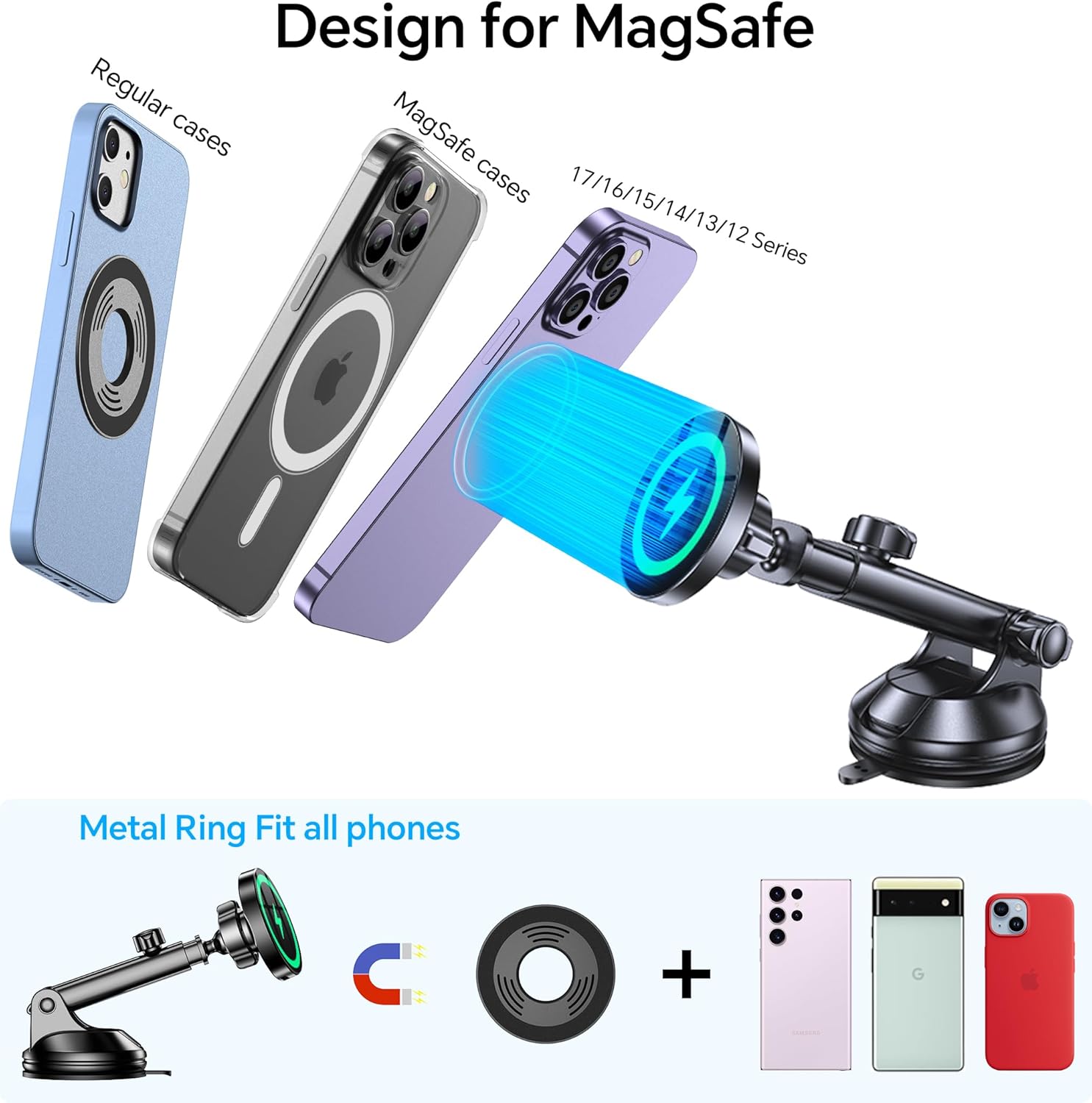 Works with apple and android phones. Does great, I have one in each vehicle and have zero complaints. It sticks well, doesn’t fall easy, easy to install. Magnet strength is great. Charge is good. Fits all the phones we have that has a mag on it.