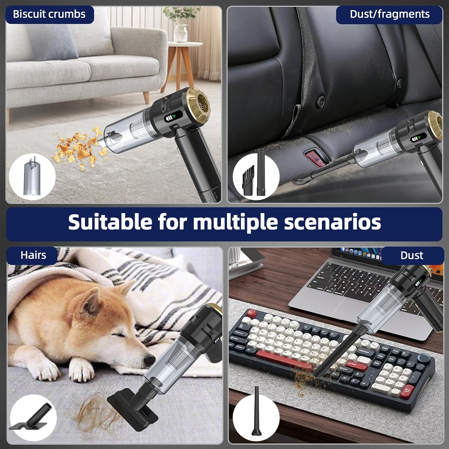 Versatile 4-in-1 System:This multi-functional handheld vacuum includes an array of tools:crevice tool,dusting brush,floor brush and air-blower attachment for varied cleaning tasks.The inflation feature assists with inflatable items like pool floats,while the extraction function compresses bags for storage solutions.
