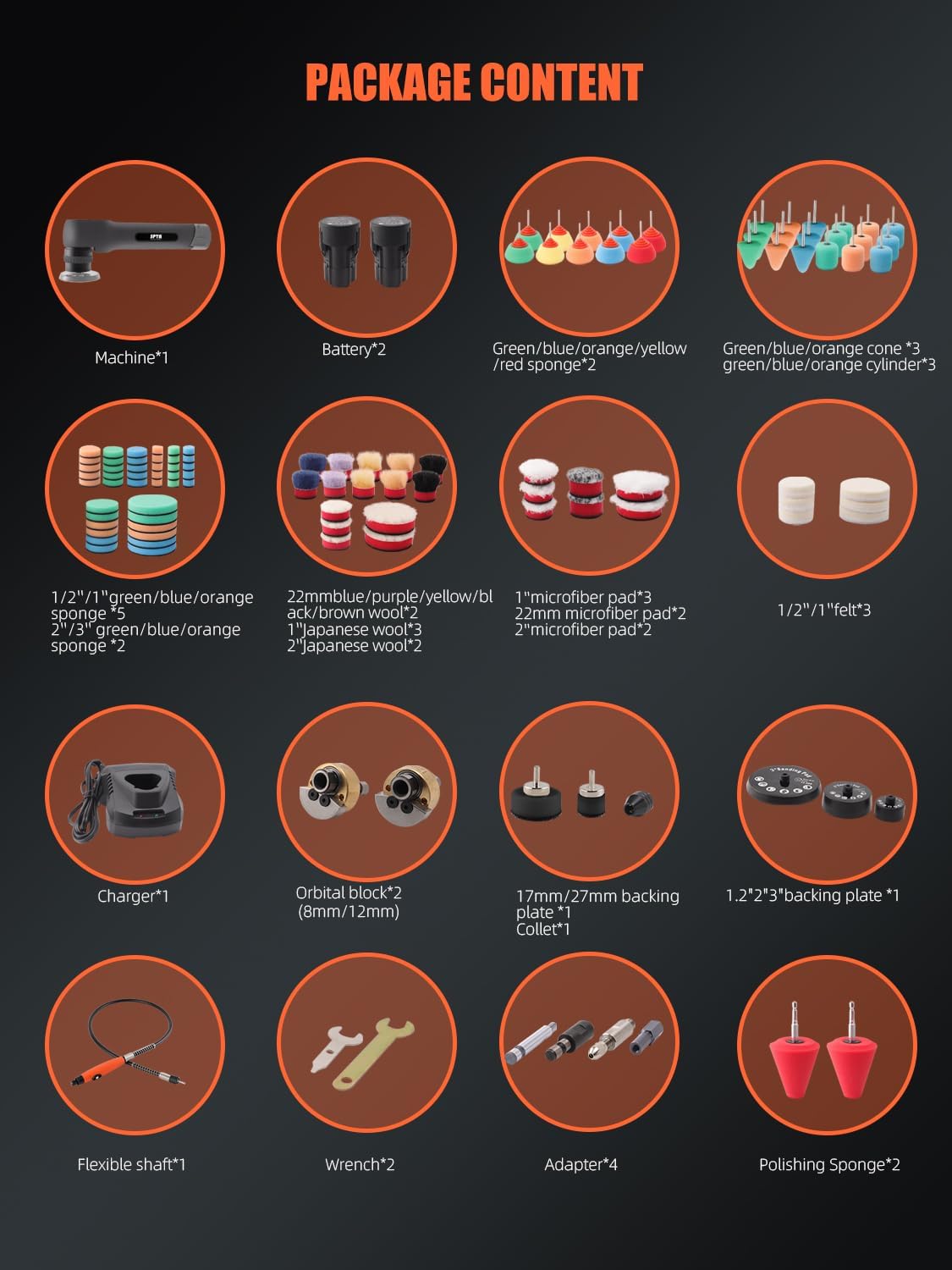 【Fast Charging and Durable】 This mini car polisher can be fully charged in only 45 minutes, using strong endurance lithium batteries, very durable, and equipped with two batteries for you, completely solve the problem of lack of power. We have prepared a very complete set of tools for you to help you polish every inch of the surface of your vehicle to perfection.