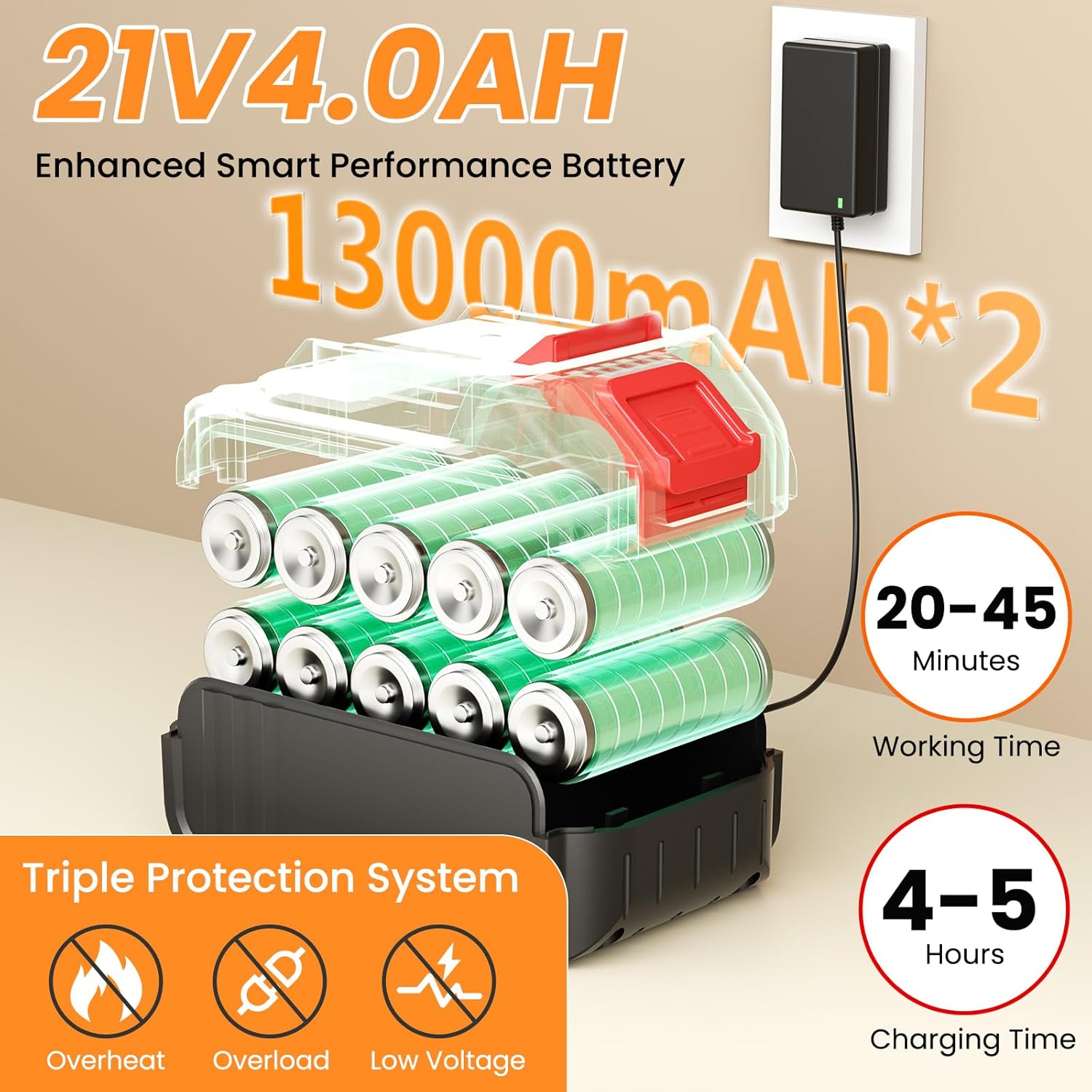 【Uninterrupted Cleaning & Portable】The battery powered pressure washer Includes two rechargeable power batteries (21V) providing 20~45 min continuous runtime per charge.And This portable cordless pressure washer is extremely lightweight,It enables free wireless cleaning operations anywhere while maintaining the portability of this handheld pressure washer design—you won’t feel tired even with extended use.