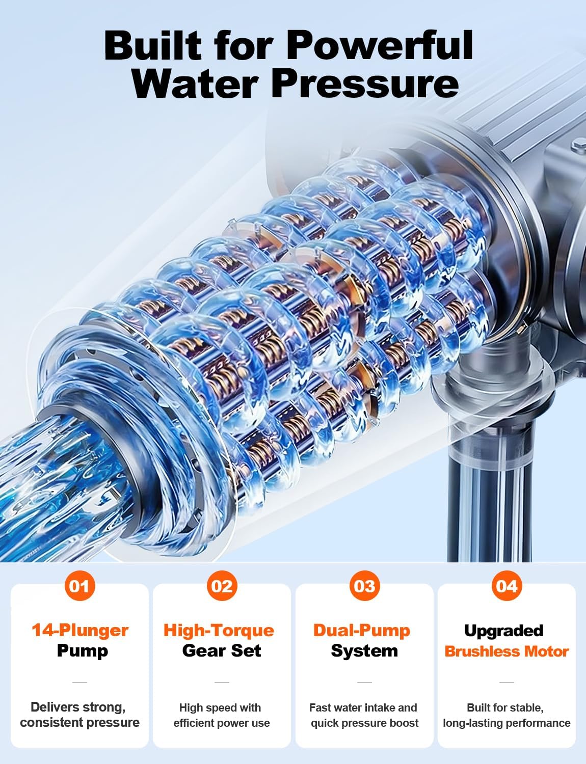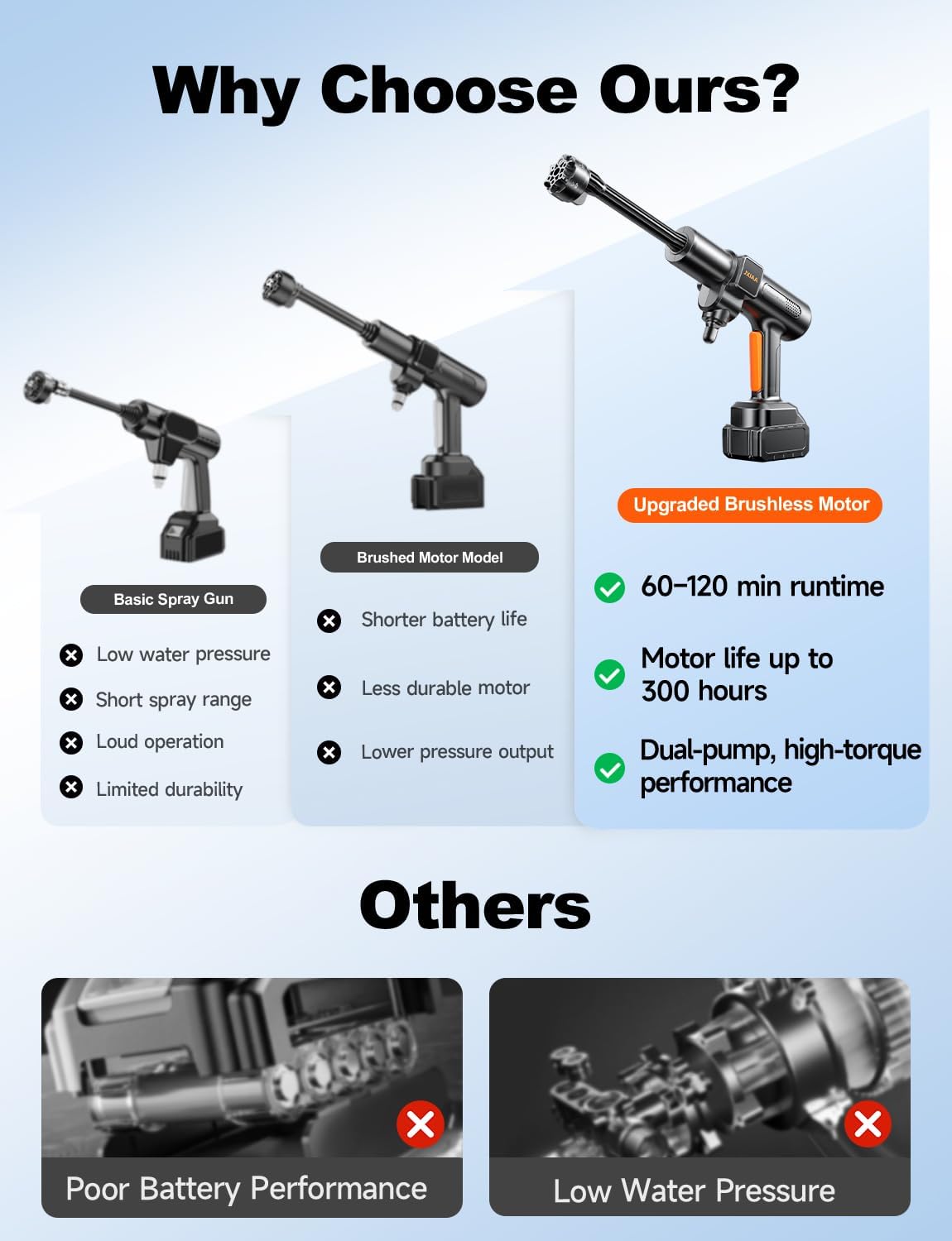 【LONG-LASTING BATTERY FOR FULL CLEANING TASKS】Designed for real cleaning sessions, the high-capacity rechargeable battery provides the power needed to wash an SUV, motorcycle, driveway section, or small patio on a single charge. The built-in smart protection system helps prevent overheating and overcharging, so you get safer, more stable performance with less downtime.