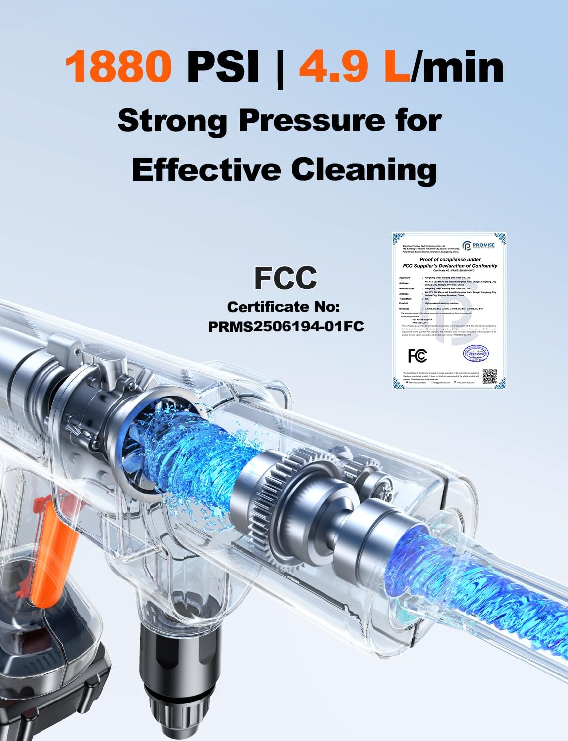 【POWERFUL CORDLESS CLEANING PERFORMANCE】Upgrade from an ordinary garden hose with this cordless pressure washer delivering up to 1880 PSI, 3.0 GPM, and a high-speed 24,000 RPM motor. It quickly removes stubborn mud from cars, SUVs, and pickup trucks, brake dust from wheels, dirt from motorcycles and bicycles, grease from driveways, and grime from patios and outdoor furniture—making it a versatile cleaning solution for vehicle care, home use, and everyday outdoor cleaning.