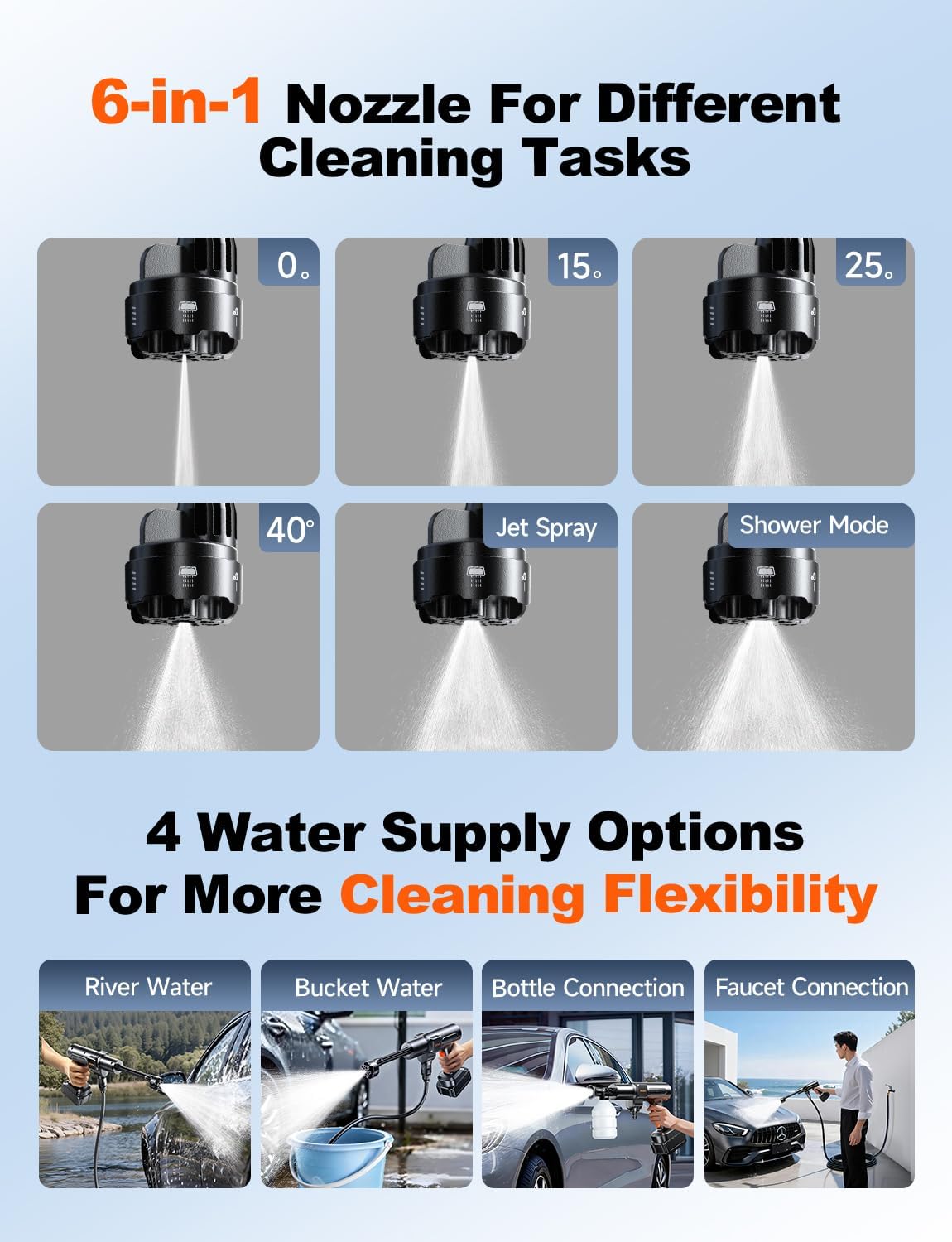 【ADJUSTABLE PRESSURE FOR EVERY CLEANING JOB】From gentle rinsing to heavy-duty cleaning, this battery powered pressure washer gives you flexible control for different surfaces and mess levels. The upgraded 6-in-1 nozzle lets you switch spray patterns in seconds, while the included foam cannon helps create a thicker wash for cars, trucks, boats, windows, decks, and more.