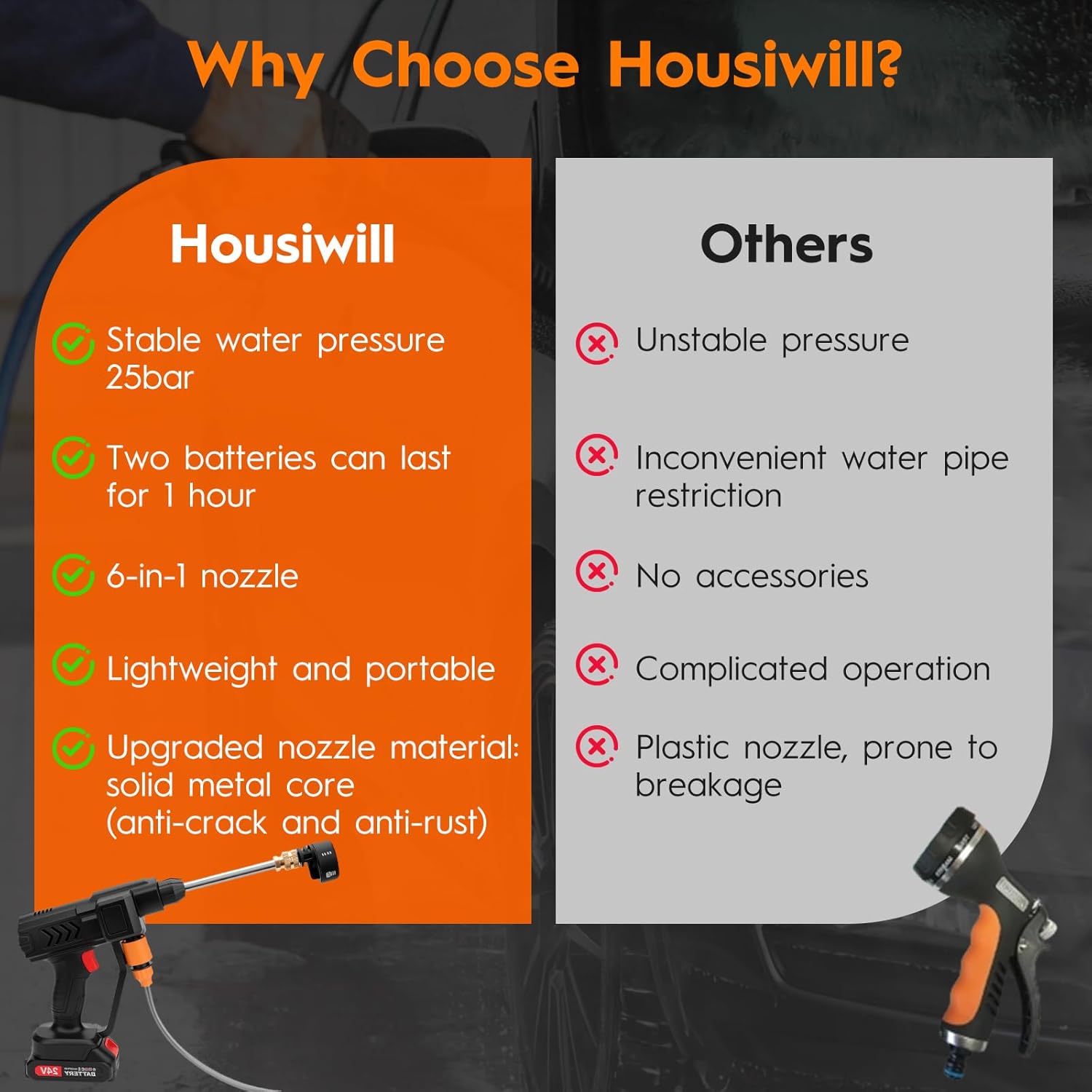 【Powerful Cordless Pressure Washer】 – Housiwill cordless power washer cleaner offers a powerful power motor, spraying at a distance of up to 6-10 meter, it is a truly portable cordless power washer that allows you to clean all your outdoor spaces and equipment easily and quickly.