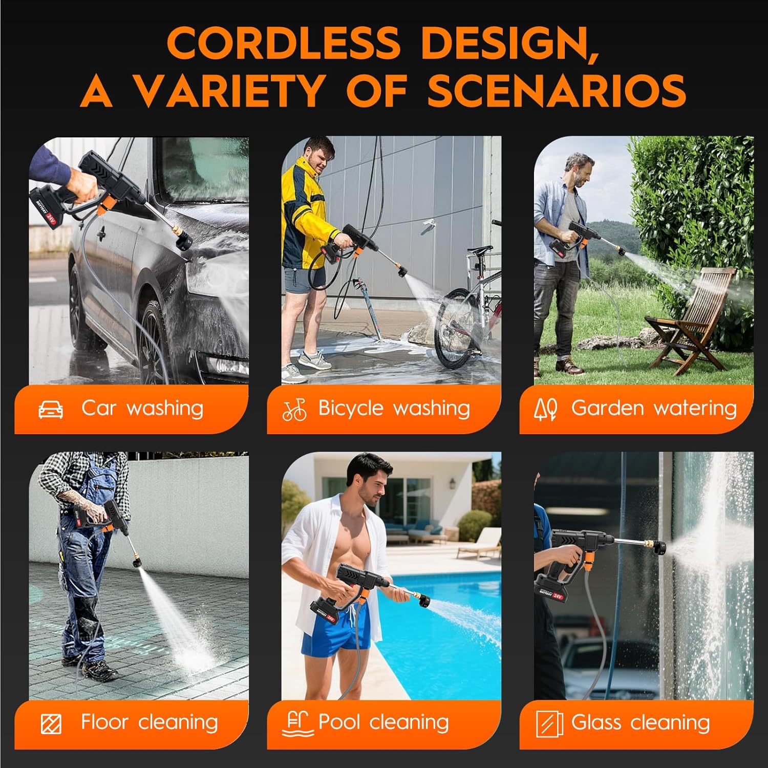 Multifunctional 6-in-1 Nozzle】 – Cordless power pressure washer equipped with 6 multifunction nozzles with multi spray modes: 0°/10°/25°/40°/shower mode, which greatly optimizes the convenience of carrying and installation. Great for watering plants, gardening tools, bikes, boats, windows, etc. The pressure washer is equipped with a foam pot for quick foaming, which is easy to clean cars and clean stains such as windows and doors, and corners that are difficult to clean.