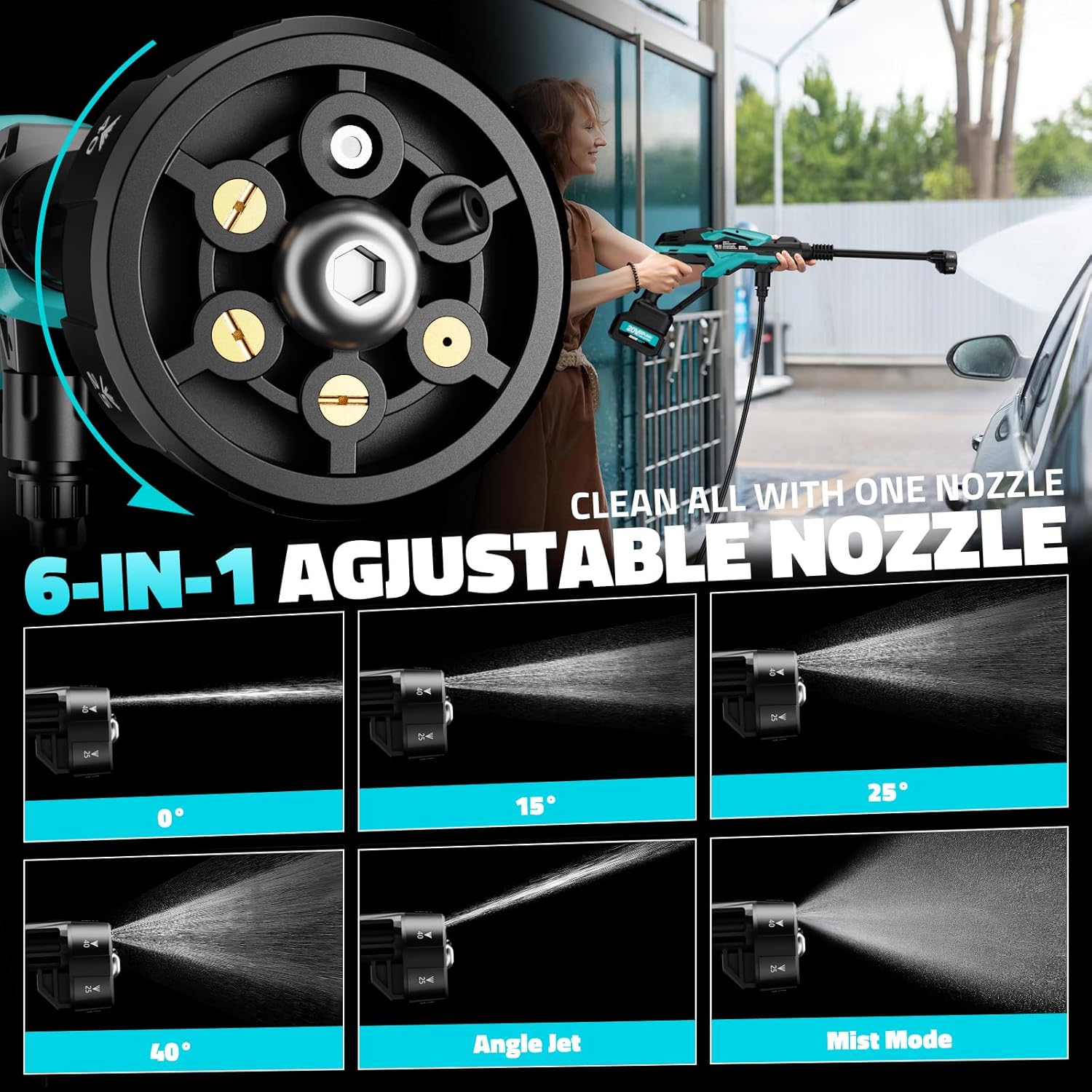 💦The Ultimate Cleaning Toolkit: 6-in-1 Quick-Connect Nozzle switch between 6 spray patterns (0°, 15°, 25°, 40°, Angle Jet, and Mist Mode) in seconds. No tools needed.With the included thick foam pot, Apply thick, clinging suds that lift dirt away effortlessly, giving your car a showroom shine. The matching suitcase allows you to store it conveniently.