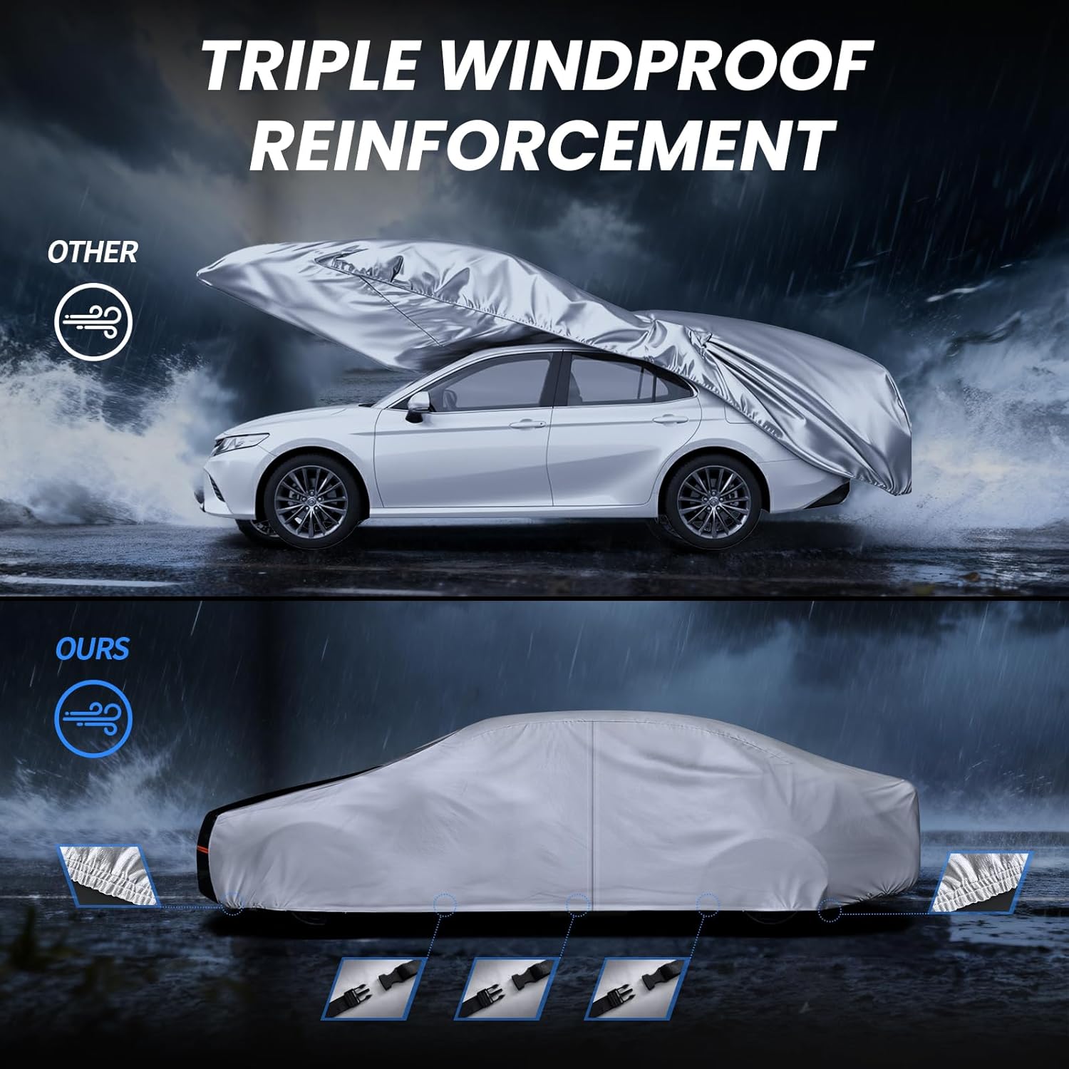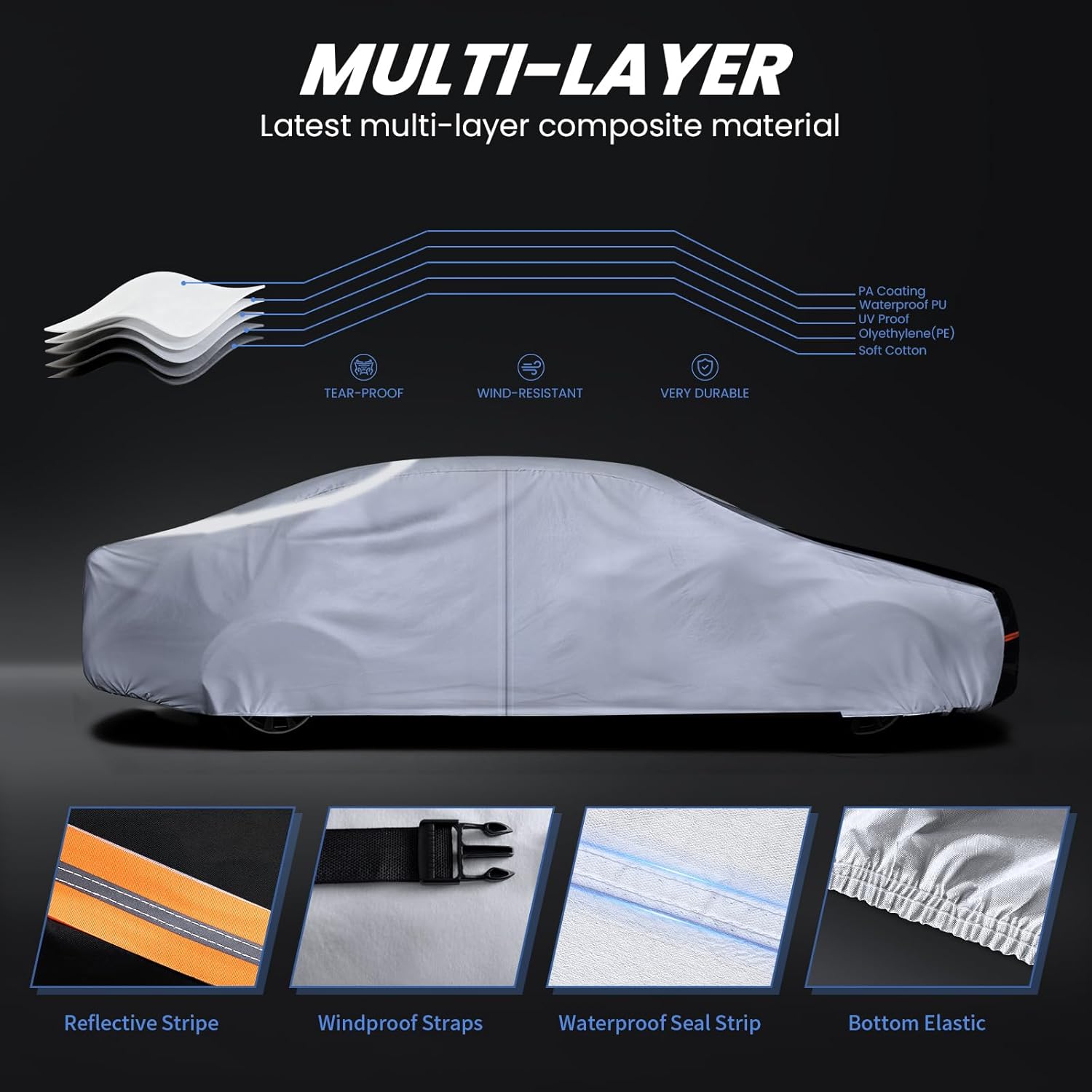 【Heavy-Duty Materials】Cotryvox car covers are constructed from heavy-duty materials. The outer layer of PE provides 100% waterproofing, while an aluminum membrane in between extends the cover’s lifespan. This makes it an excellent choice for long-term use.