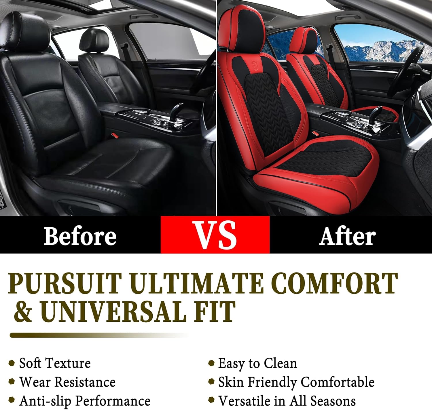 【Cool Look】Car seat protector is made of premium porous leatherette, our seat covers are breathable and comfortable to touch. Sport look of the cover will add a sence of modern and sleek to your auto interior