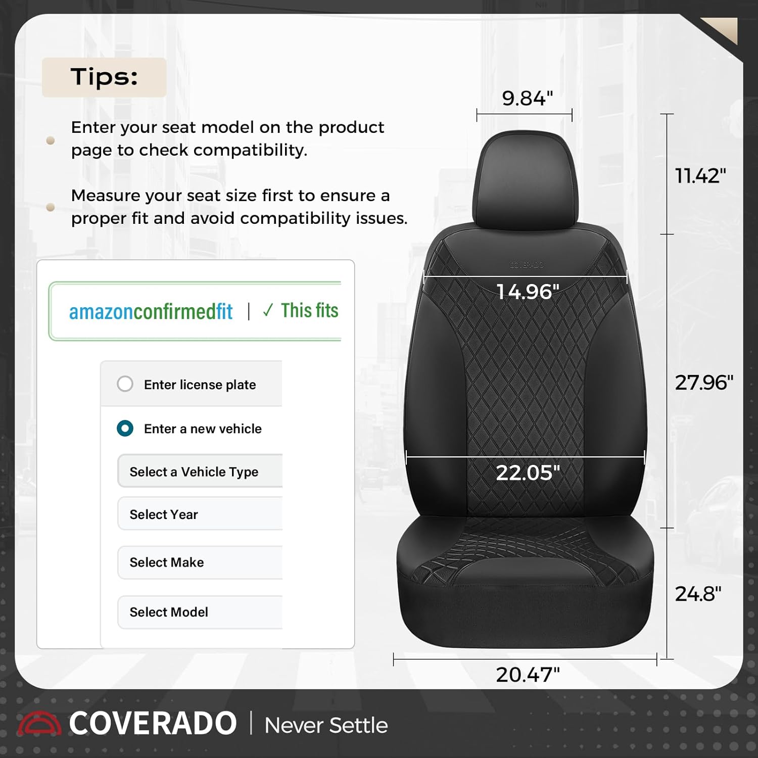 Warm Tip: It is not suitable for all years. Please check the compatible pictures carefully before ordering. Then you will get a superb quality brand new interior. If the seat cover is not compatible, please let us know and we will provide a solution as soon as possible.Fit for Alfa Romeo: Giulia, Stelvio/ Fit for Acura: TLX, RDX/Fit for Audi A3, A4, A5, A6, Q2, Q3, Q5/ Fit for INFINITI: EX35, EX37, FX35, FX45, FX50, M37, M45, M56, I35, I30, Q70, QX30, QX50, Q50Fit for BMW: 1 Series, 2 Series, 3 Series, 5 Series, X1, X2, X3, X4, X5, X6/ Fit for Buick: Envision, Cascada, Encore, LaCrosse, Lucerne, Regal, Verano/ Fit for Subaru: Crosstrek, Ascent, Forester, Impreza, Legacy, Outback, WRXFit for Cadillac: ATS, CT6, CTS, DTS, SRX, XTS, CT5, CT4/ Fit for Chevrolet: Aveo, Bolt EUV, Bolt EV, Caprice, Cruze, Sonic, Volt, Blazer, Equinox, Malibu, Trailblazer, Silverado/ Fit for Chrysler: 200, 300Fit for Honda: Accord, Civic, CR-V, City, Clarity, Insight/ Fit for Hyundai: Accent, Azera, Kona, Nexo, Venue, Sonata, Elantra, Ioniq, Santa Fe, Tucson/ Fit for Toyota: Avalon, Camry, Corolla, RAV4, Yaris, Prius C, VenzaFit for Maserati: Levante/ Fit for Mazda: 3, CX-3, CX-30, CX-5, 6/ Fit for Mercedes-Benz: GLC, GLE, GLK, ML/ Fit for Mitsubishi: Montero Sport, Mirage, Mirage G4, Lancer, Outlander, Eclipse Cross/ Fit for Mini: CooperDiscovery/Fit for Lexus: ES250, CT200h, GS350, GS450h, LS500, ES300h, ES350, IS350, IS500, NX350h, RX350, RX450h, UX250h/Fit for Lincoln: MKZ, Continental, Corsair, Nautilus, MKC, MKS, MKX/ Fit for Ford: Fiesta, Focus, Fusion, Taurus, Escape, Edge, MaverickFit for Volkswagen: Arteon, Atlas, Golf, CC, Polo, Passat, Jetta, Taos, Tiguan, Touareg/ Fit for Volvo: S40, S60, S70, S80, S90, V40, V50, V60, V70, V90, XC60, XC70, XC90/ Fit for Jeep: Cherokee, Compass, Gladiator, Renegade/ Fit for Jaguar: E-Pace, F-Pace, I-Pace, S-Type, XE, XF, XJ, XJ8Fit for Kia: Rio, Rondo, Stinger, Seltos, Spectra, Sorento, Soul, Cadenza, Forte, K900, Niro, Optima, Sportage, Forte5, K5/ Fit for Nissan: LEAF, Qashqai, Murano, Pathfinder, Versa, Versa Note, Altima, Maxima, Rogue, X-TrailFit for Land Rover: Defender, Range Rover Evoque, Range Rover Velar/ Fit for Genesis: G70, G80, G90, GV70, GV80/ Fit for GMC: Acadia, Terrain/ Fit for Porsche: Macan/ Fit for Renault: Koleos, Duster/ Fit for Dodge Ram