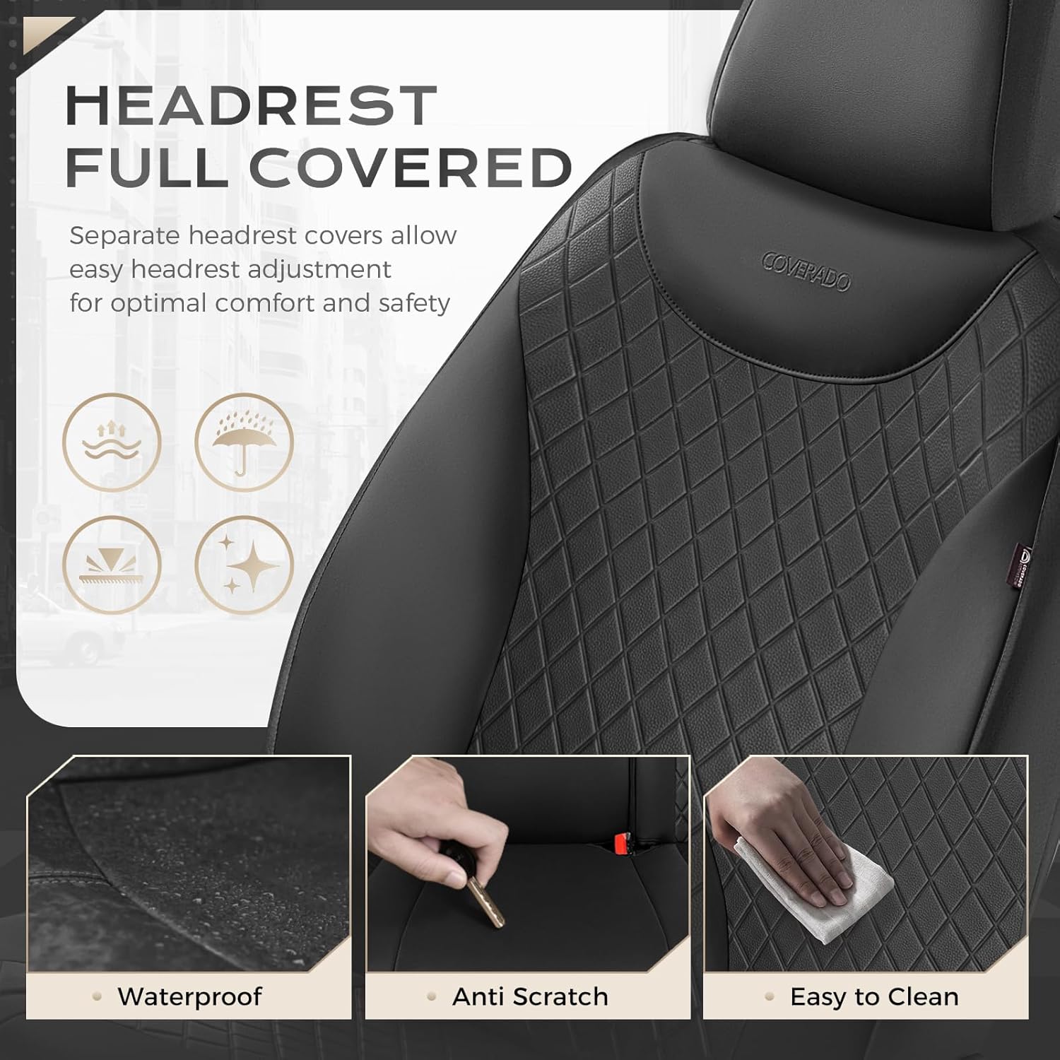 Easy to Maintain: Made from high-quality synthetic leather with multi-layer waterproof technology, Coverado car seat covers effectively repel liquid spills, mud stains and pet hair. These seat covers are easy to clean with a damp cloth, ideal for outdoor adventures and families with active kids and pets