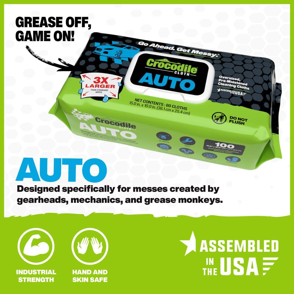 Crocodile Cloth Auto Cleaning Wipes – 100 XL (15″ x 10″) Disposable Wipes for Car Engine Degreasing, Body Detailing & Tire Cleaning – Cuts Grease, Oil, Adhesives on Hands, Tools, Parts & More