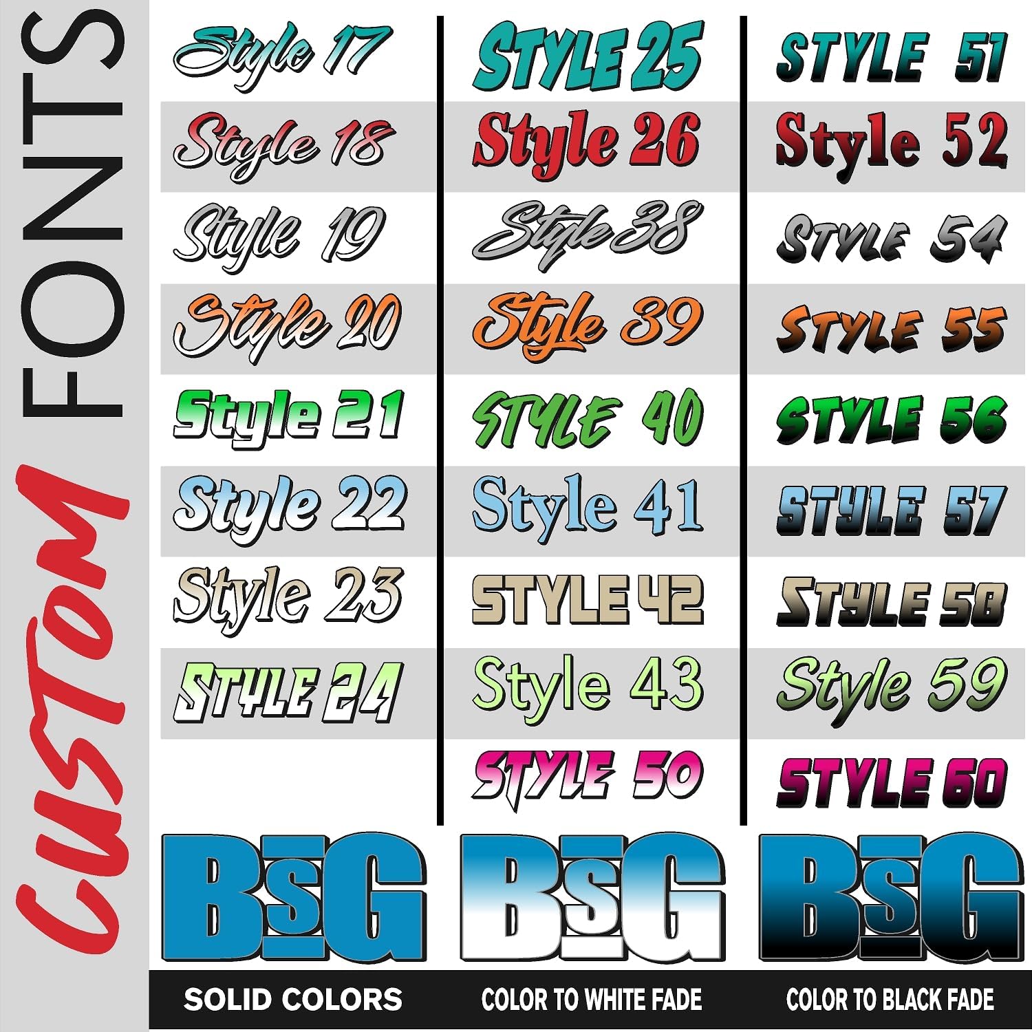 Custom Text Decals are sold INDUVIDUALLY. if you need one for each side PLEASE order a quantity of TWO.Unlimited design options with our specialized font styles.