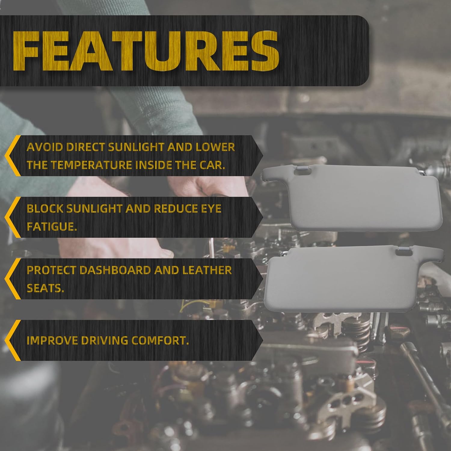 Product Features:Replace your old and damaged sun visor with ease.Reduce direct sunlight to the driver’s eyes, enhancing driving safety and comfort.