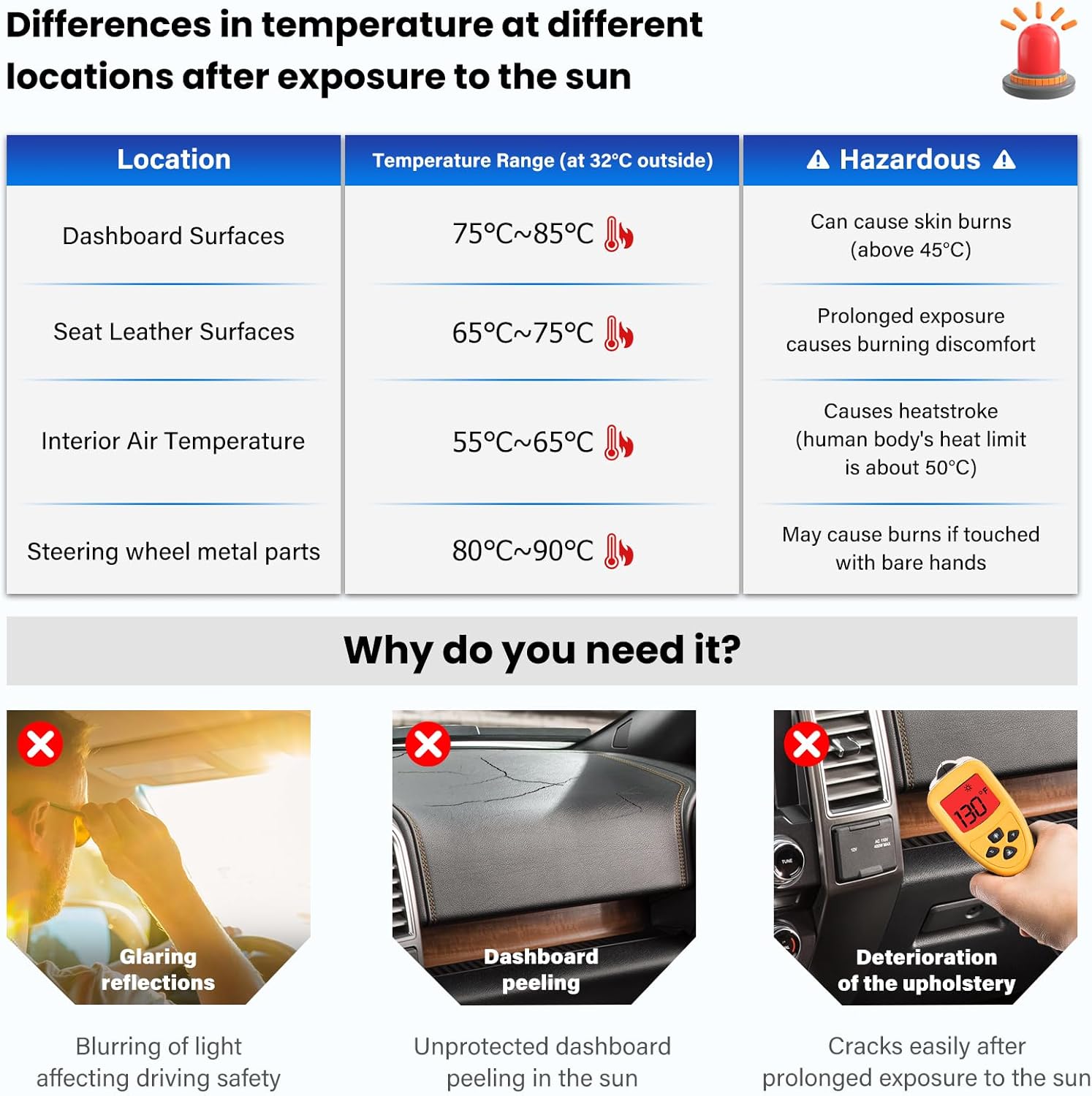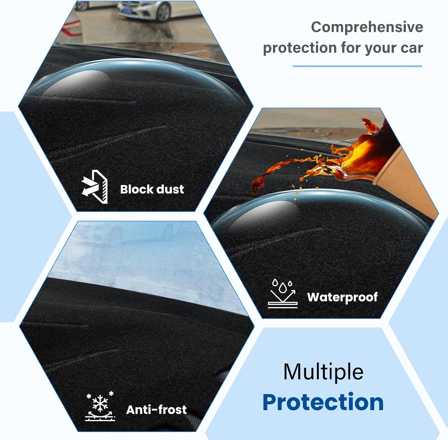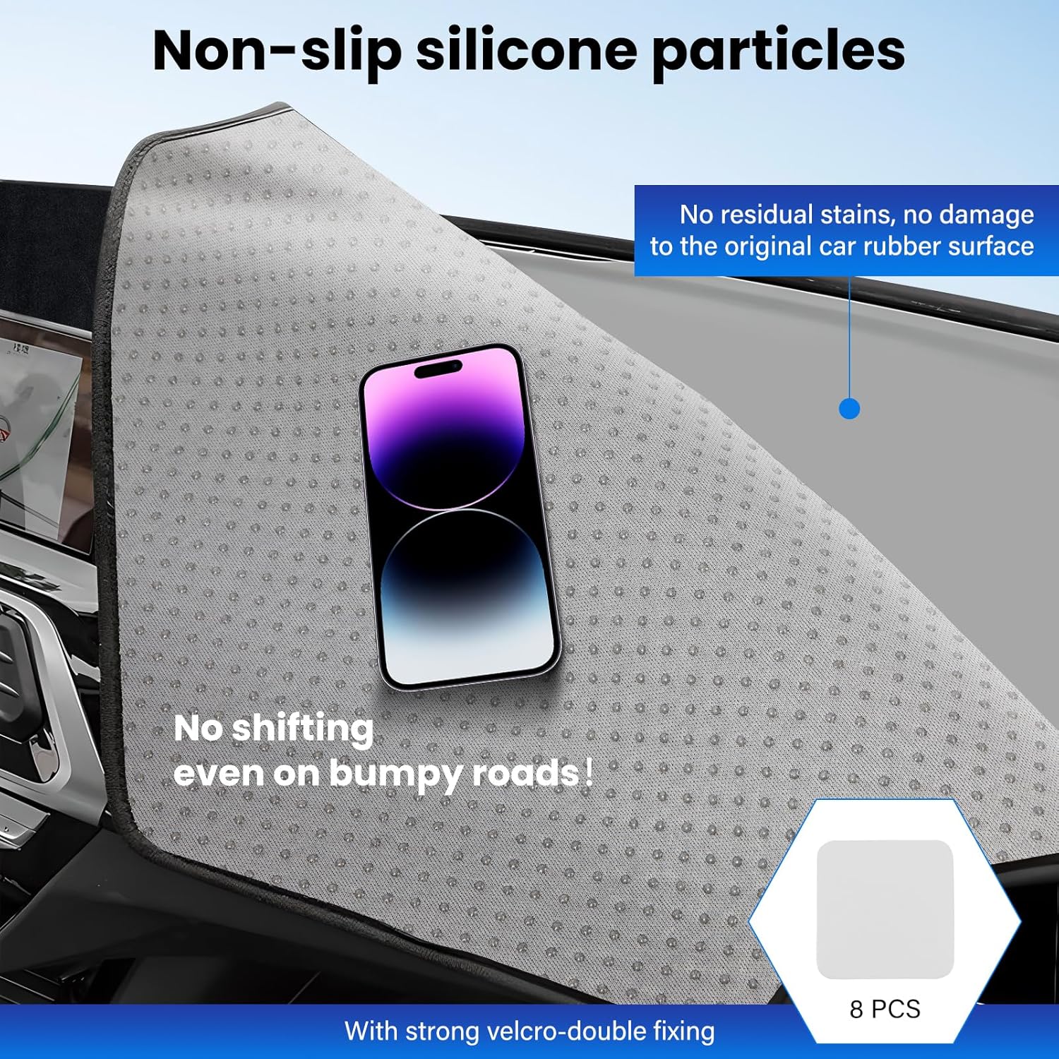 Perfect Fit & Anti-Slip Design:Our Dashboard Precision-cut for your specific car model,ensuring seamless coverage without wrinkles. The silicone-grip backing and Velcro strips prevent sliding, even on bumpy roads—no residue or adhesive damage