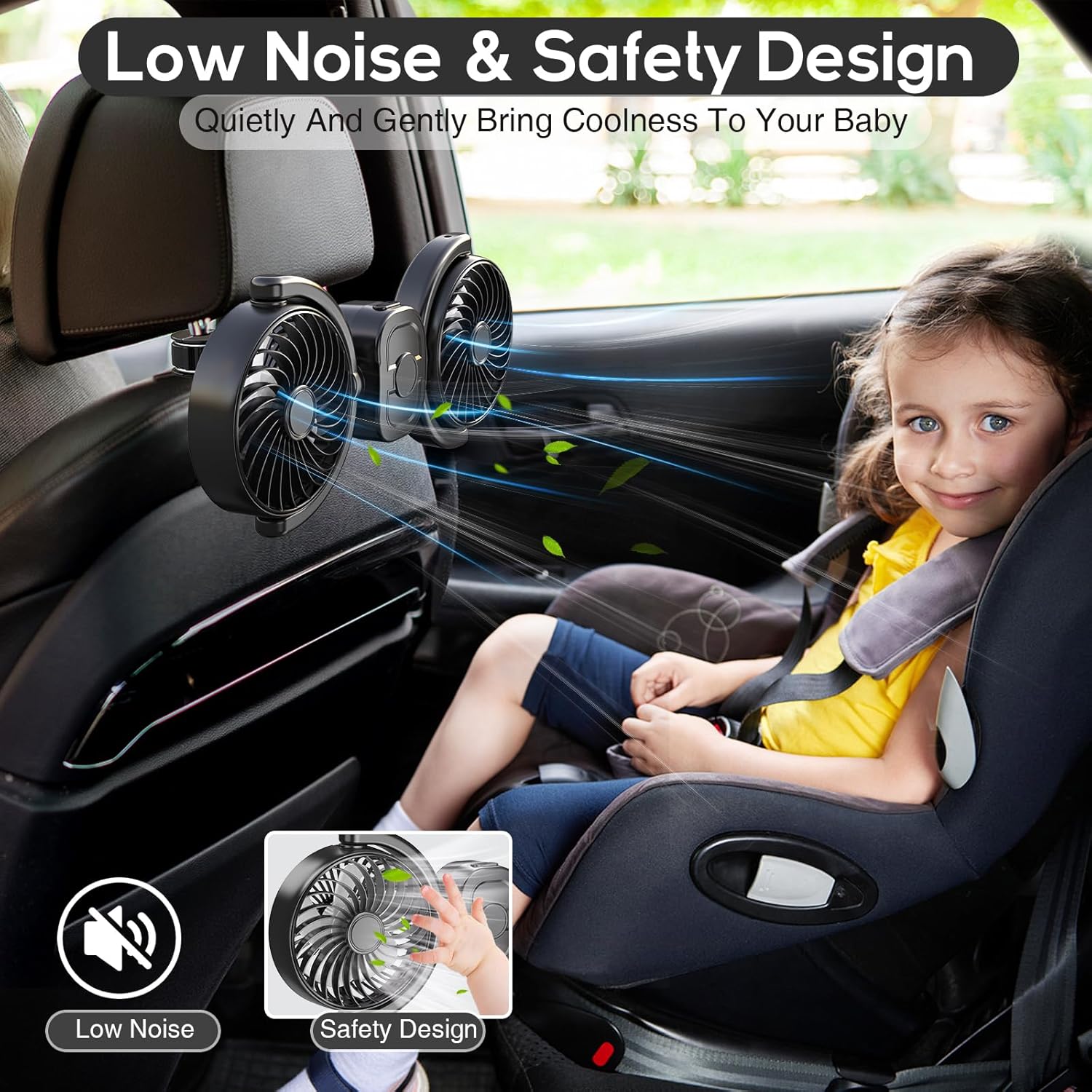Powerful Dual-Head Fan with Bigger Blades for Maximum Cooling: Say goodbye to hot, stuffy car rides! Our upgraded dual-head fan for car features larger blades that deliver powerful, refreshing airflow to both front and back seat passengers. Perfect for keeping kids, pets, and the whole family comfortably cool on long road trips or sweltering summer days