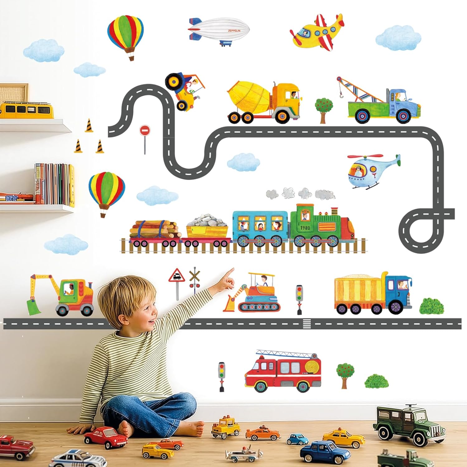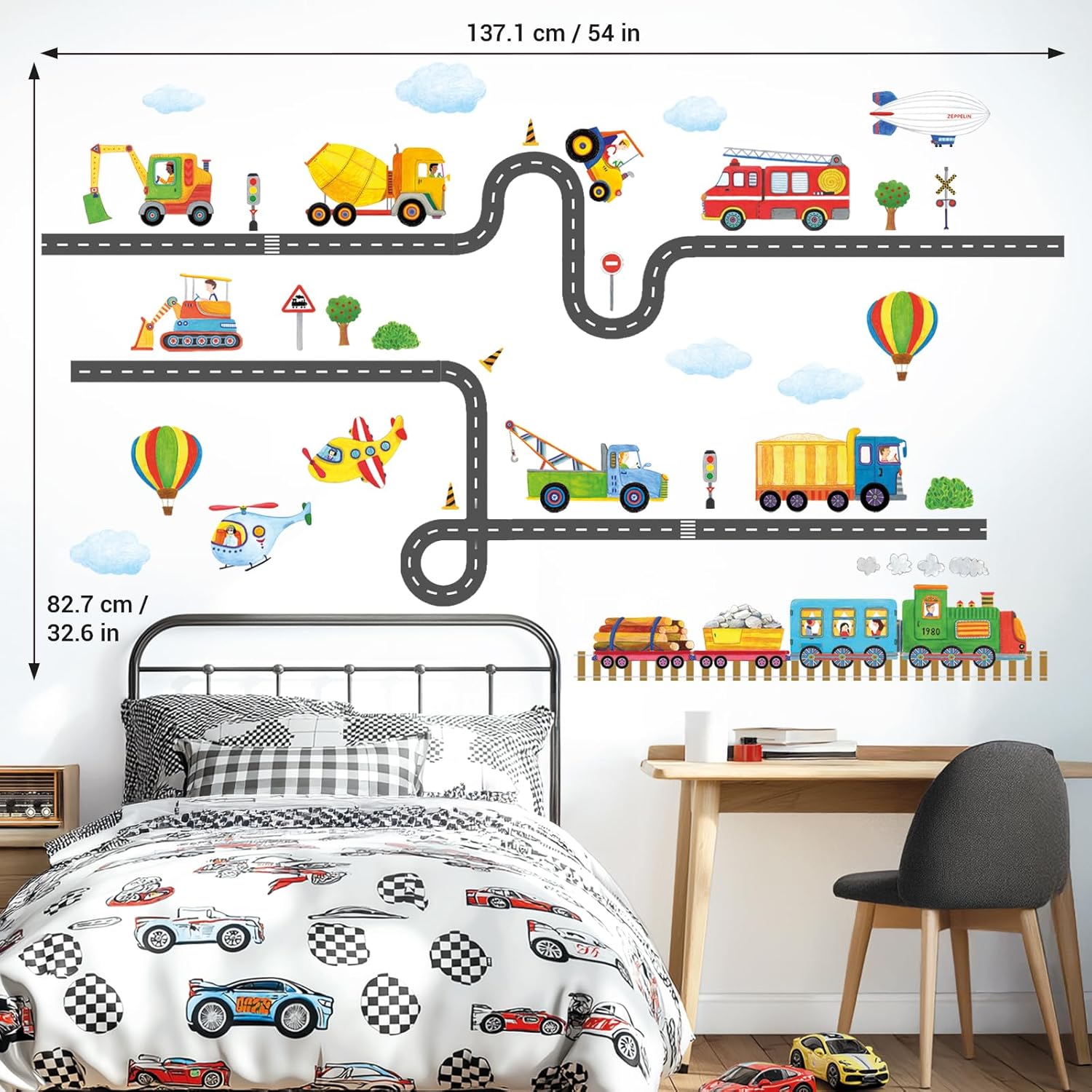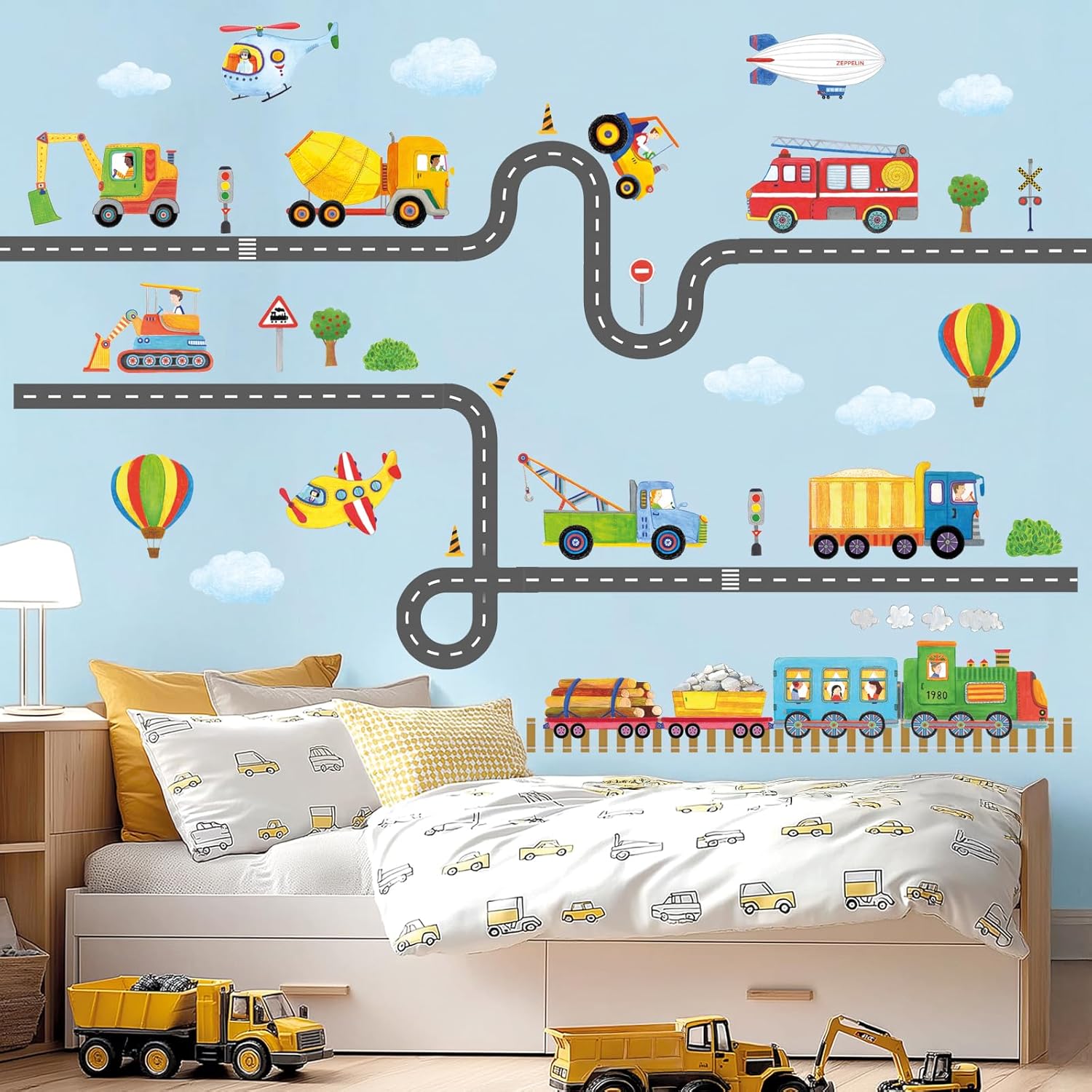 Transform your child’s room with these fun car and road wall sticker designs! Featuring colorful vehicles, road signs, and trees, this artwork sparks the imagination and teaches about transportation. Children will enjoy playing and learning through roads that can be connected in one long or two lines and vehicles such as fire trucks, excavators, and trains. It’s the perfect combination of fun and education for endless fun!