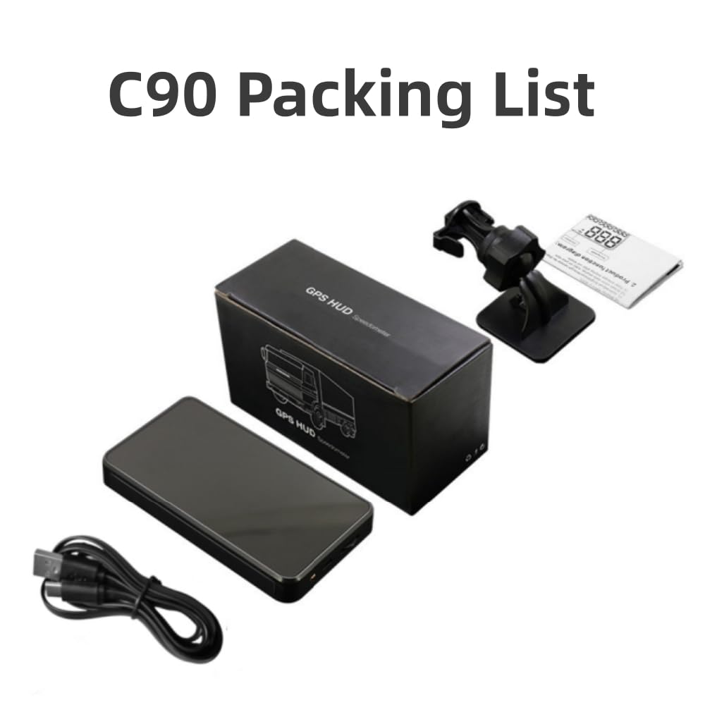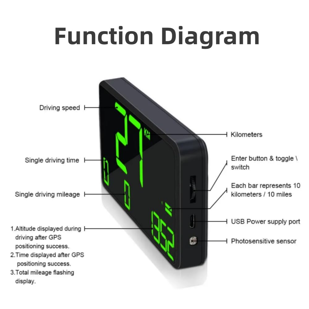 【9-in-1 HUD】Heads up display, it has multifunctions – Vehicle driving speed, Driving time, Driving mileage, Total mileage, Over-speed alarm, Fatigue driving warning, Local time, Altitude, freely switch between kilometers and miles.