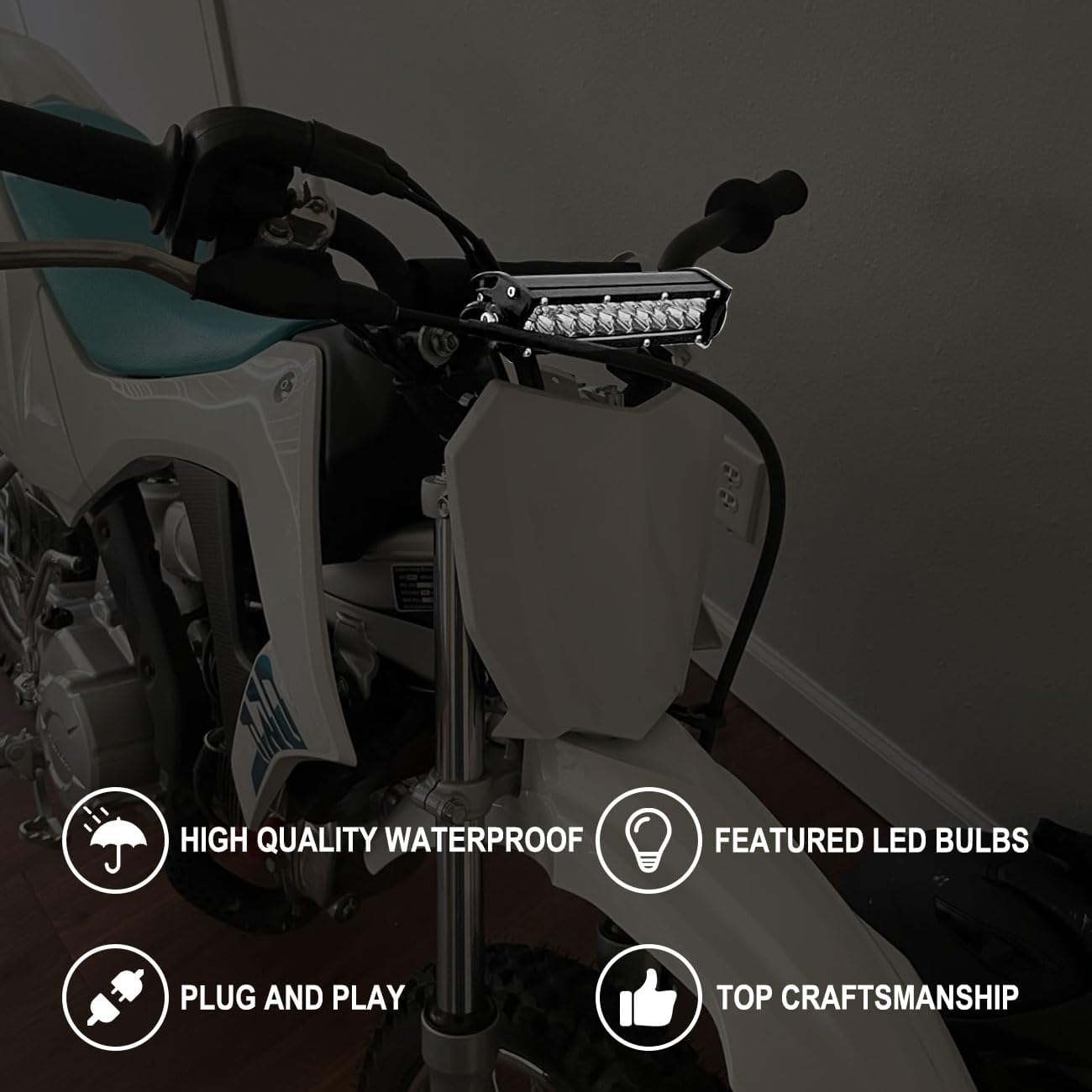 Applicability: The Light bar kit universal for 7/8” Handlebar. Such as for Yamaha, for Honda, for Kawasaki, for Suzuki and FOR CRF110, CRF230F, CRF250F, CRF250R, CRF450R, DRZ400, TTR110E, TTR110, KLX110, KLX140, KLX250, RM85, RMZ250, YZ250f, YZ125, YZF450 all years Pit Dirt Bike. For more models please continue browsing the product description