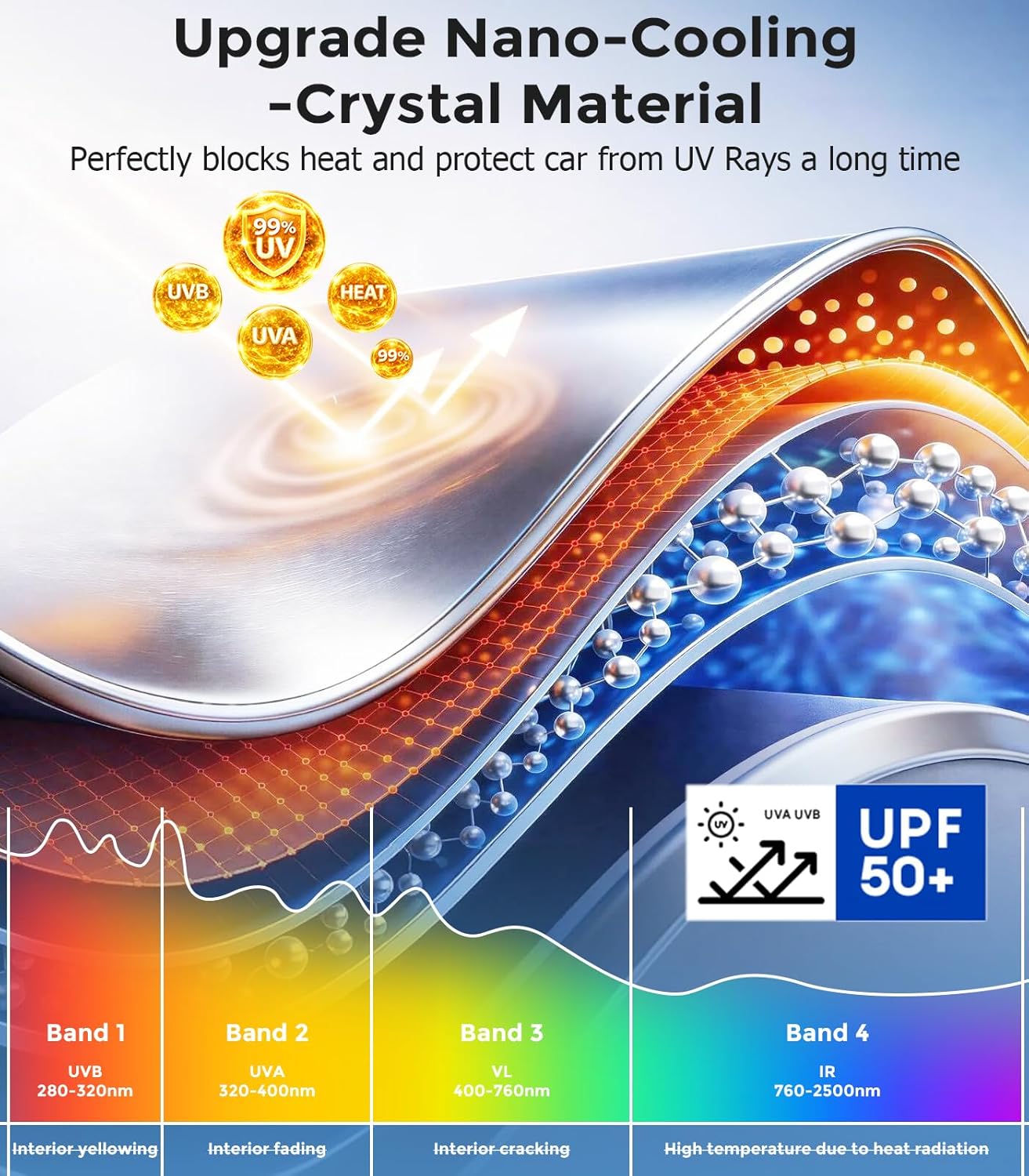 [Upgrade ICE-CRYSTALS Cooling Coating] – The upgrade cooling coating with excellent sunshade protection ability, ensuring the car interior stays cool immediately after parking. Besides, prevents seats, dashboards, and other interior components from aging, cracking, or fading due to prolonged exposure to heat, extending the lifespan of your car’s interior and saving up to 30% on maintenance costs.