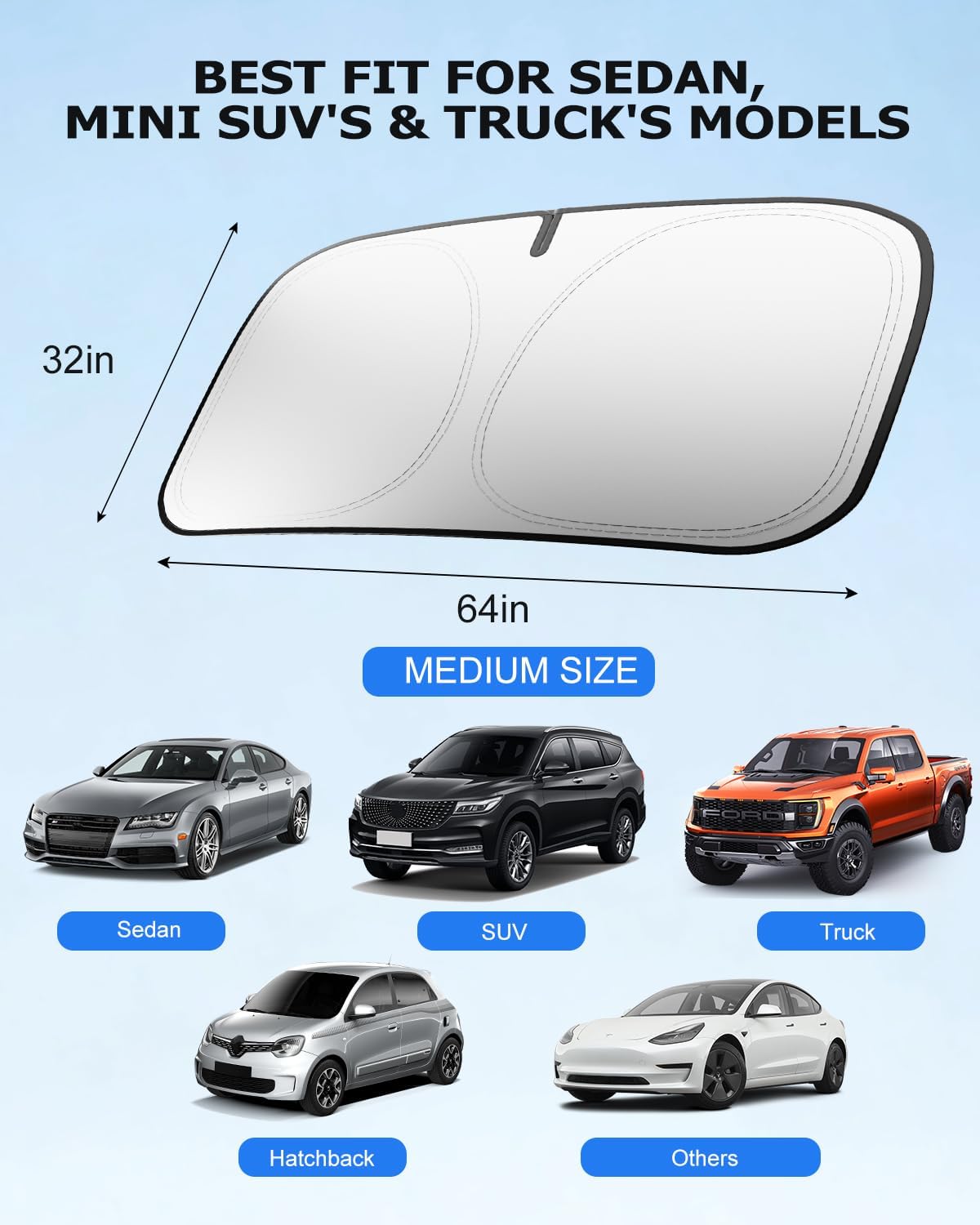 I bought this Windshield Sunshade recently. It helps keep my car cool and protects the inside from sun damage. Here is my experience with this product:Easy Setup & Storage: This sunshade is easy to set up and remove. The metal frame made of memory material lets it pop open quickly. It fits well against the windshield. When I finish using it, I twist and fold it back into the storage bag. It is convenient to store in the car without taking much space.Cooling & Interior Protection: The temperature difference is immediate. Before I used this shade, my car felt like an oven after sitting in the sun for a few hours. Now, it stays much cooler. My dashboard and seats are safe from UV rays. These rays can cause fading and cracking over time.Durability & Fit: The memory metal frame is durable. It keeps its shape after many uses. The shade is lightweight and sturdy. The reflective material has good quality. It blocks heat well. This sunshade fits many cars. I use it in my SUV. It also fits well in my friend’s sedan and my truck.Final Verdict: This Windshield Sunshade is an important accessory for anyone who wants to protect their car’s inside and stay cool on hot days. The easy setup, strong build, and good heat-blocking make it a good buy.