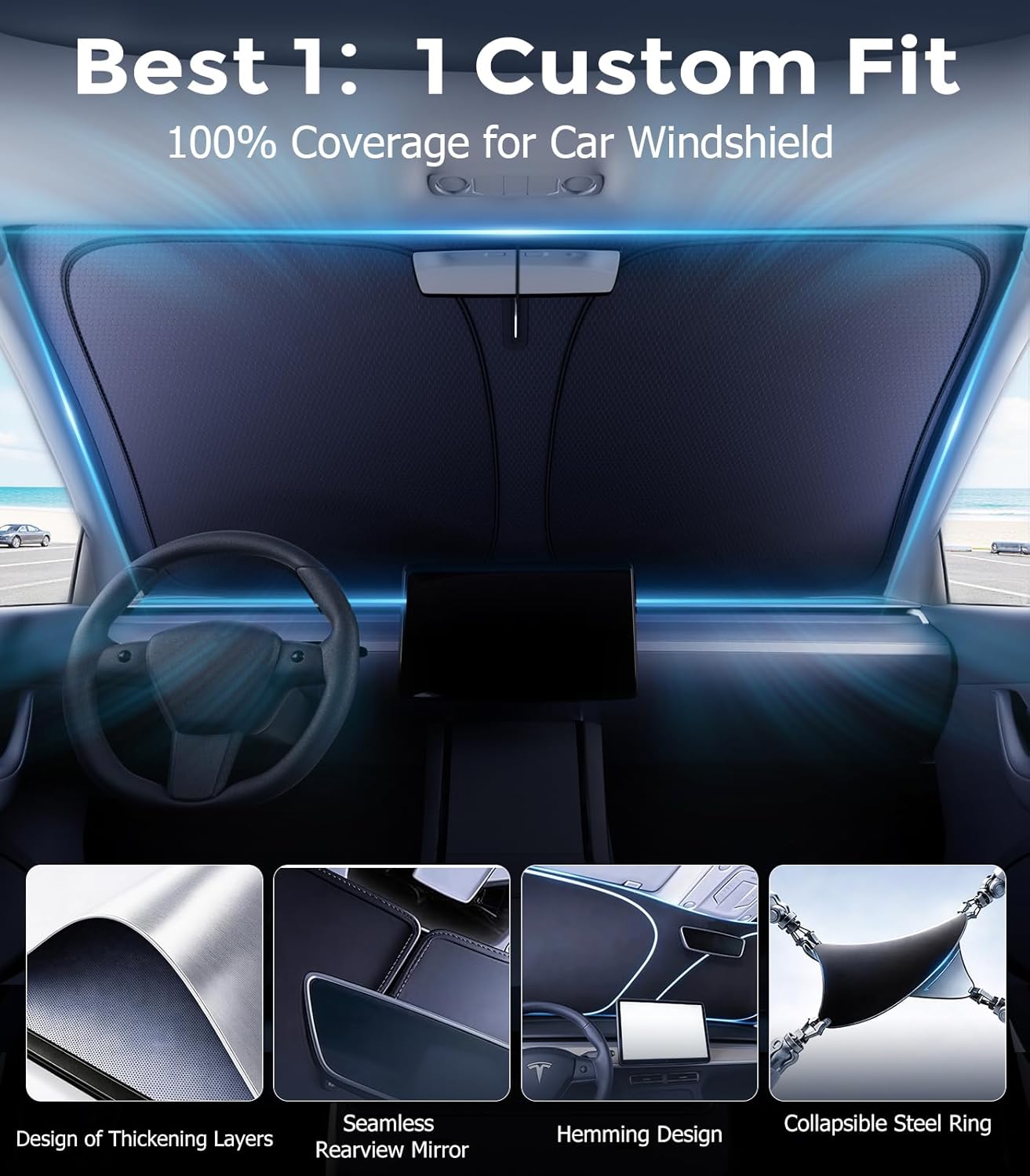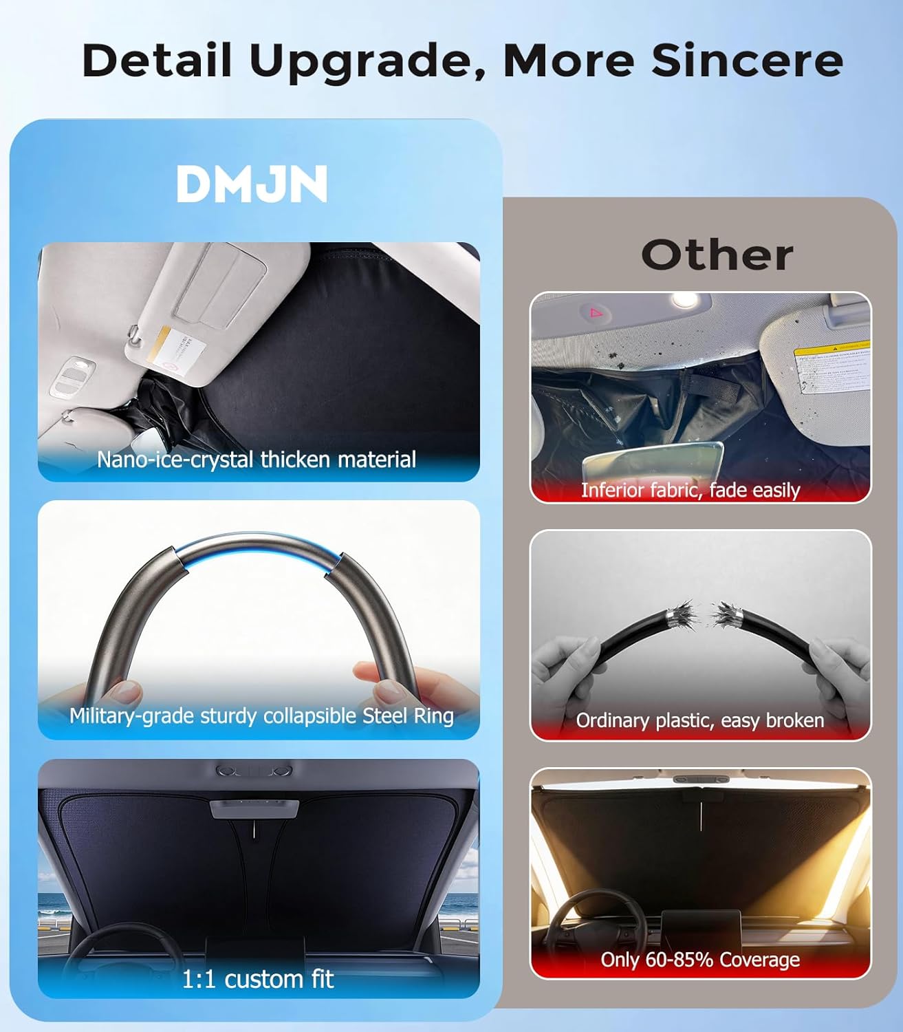 I recently purchased the DMJN Designed Windshield Sun Shade for my Tesla Model Y, and I couldn’t be happier! This sunshade features an innovative ice-crystal-cooling coating that effectively keeps my car cool, even on the hottest days.Installation was a breeze, and the sunshade provides excellent coverage, fitting snugly against the windshield for maximum protection. I also appreciate the thoughtful inclusion of a storage bag, making it easy to stow away when not in use.Since using the DMJN sunshade, my interior stays significantly cooler, which not only enhances comfort but also protects my dashboard and upholstery from sun damage. I highly recommend it for all Tesla Model Y and Model S (2016-2025) owners looking for a quality sunshade that combines functionality and style. Overall, it’s a fantastic investment for anyone wanting to keep their vehicle cool and protected!