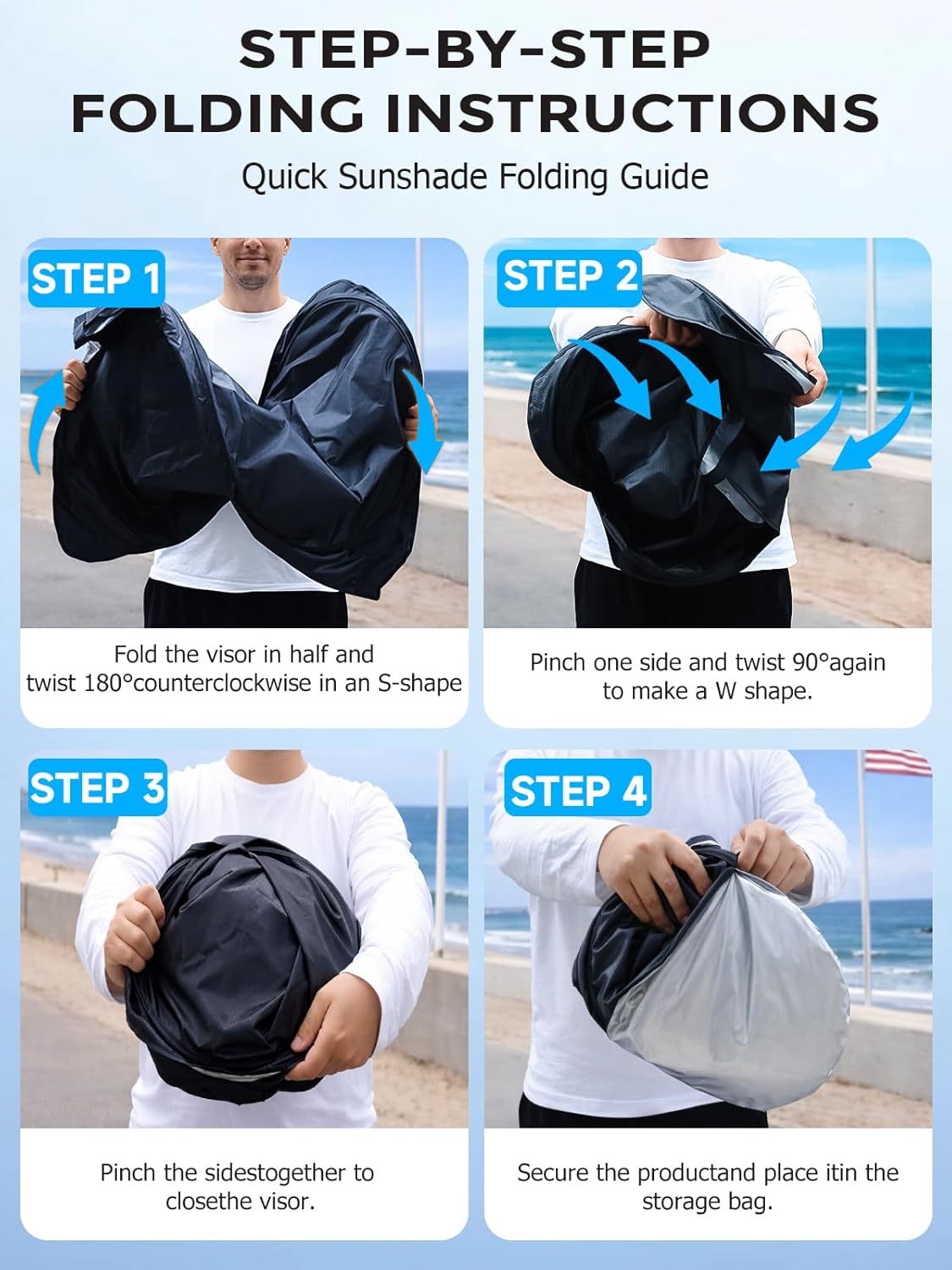 [Military-Grade Memory Metal Frame for Durability] – Built with a military-grade memory metal frame, ensuring the sunshade maintains its structure over time. Even with frequent folding, it quickly rebounds to its original shape without deformation or damage. The lightweight yet durable design makes it easy to carry while maintaining stability and performance in extreme weather conditions.