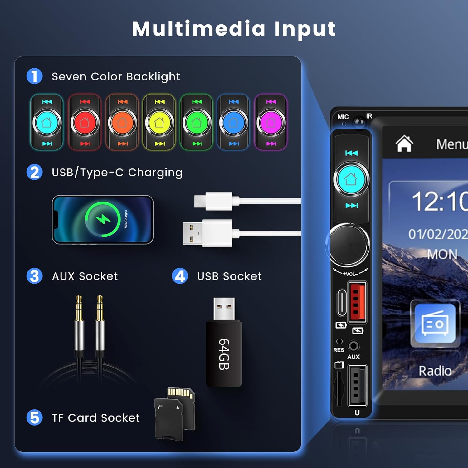 Versatile Connectivity Options: The multi-function USB port supports music playback from USB drives and also serves as a high-current charging port for your mobile devices. The Type-C interface offers faster data transfer speeds, efficient power delivery, and universal compatibility with modern devices, providing seamless connectivity for charging and multimedia streaming. Additionally, the double din car player supports SD card insertion, expanding your media storage and playback options