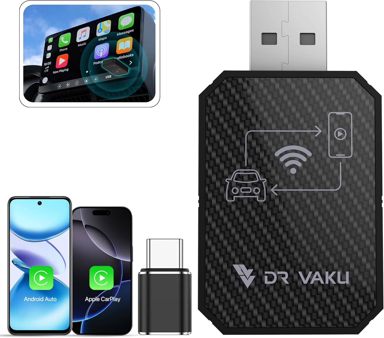 DR VAKU® AUTOELITE 2-in-1 Wireless Car Receiver, Converts Wired Auto Android & CarPlay to Wireless, Bluetooth Connectivity, Only for Cars with OEM Installed Wired Android Auto/CarPlay (Black)