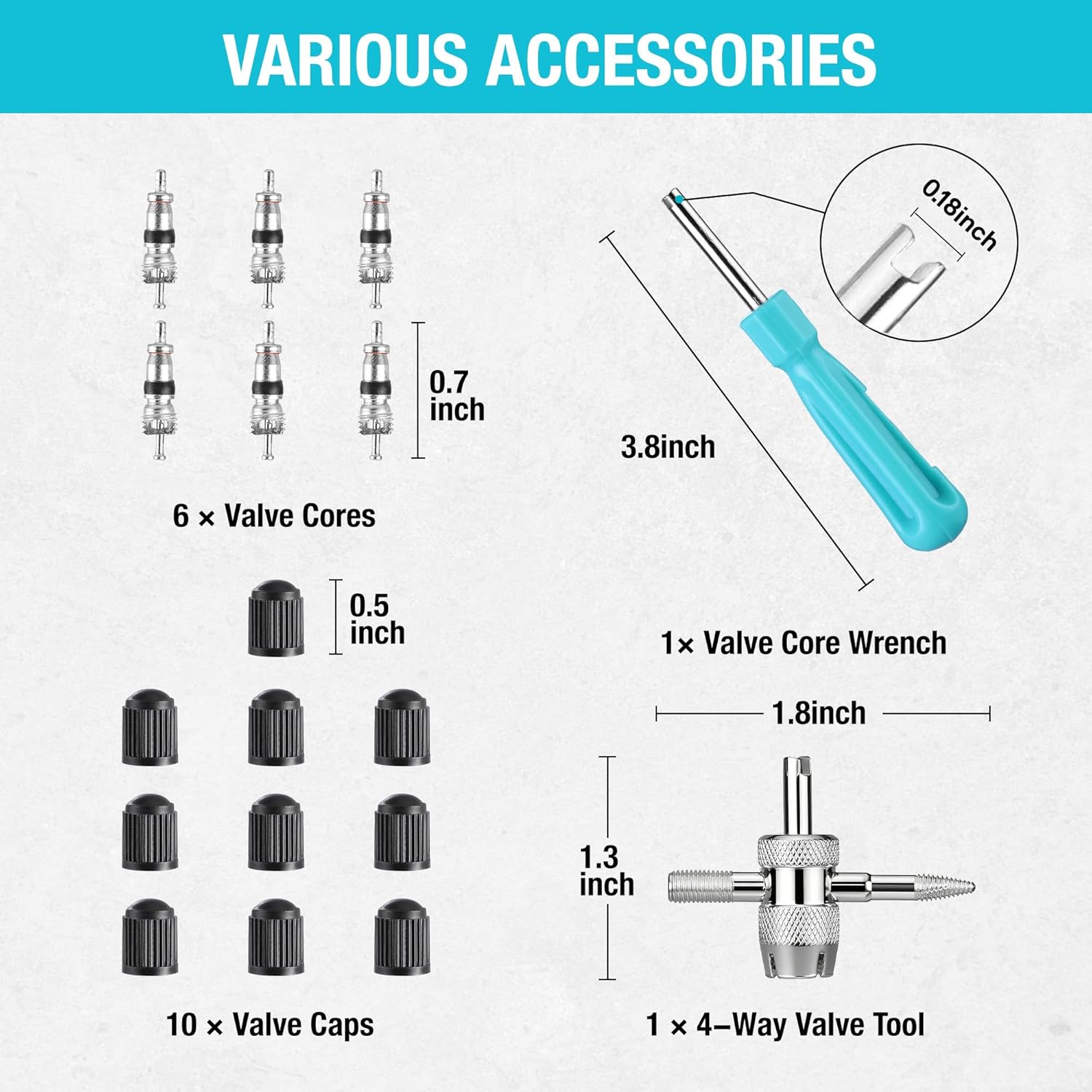 VERSATILE TOOLS: The rim protectors help prevent scratches and damage to your rims. The four-way valve tool supports valve stem pulling, air release, and debris cleaning. A dedicated valve core wrench is also included for easy valve core replacement