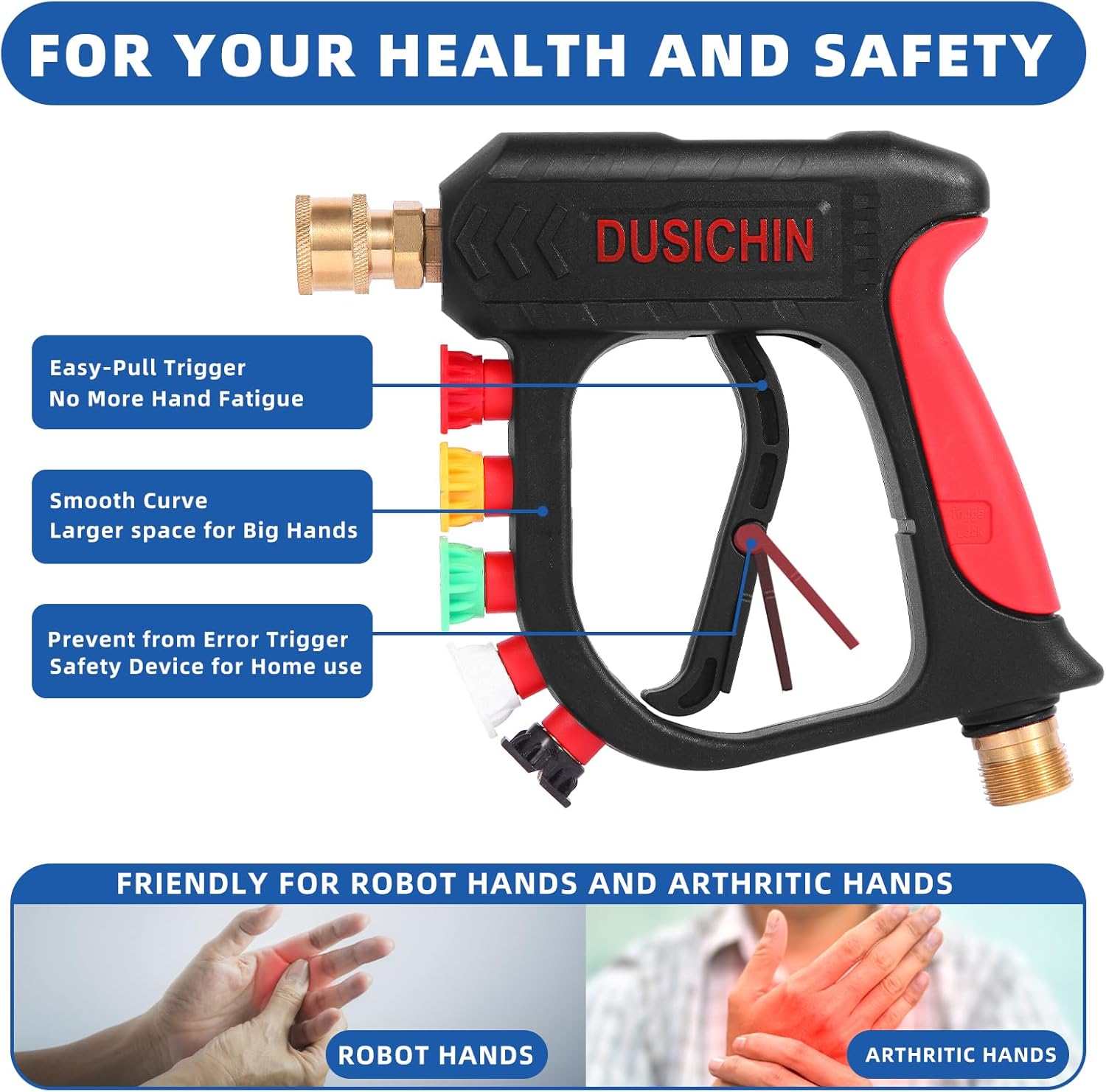 【Pressure Washer Gun, not for garden hose】: With the 1/4 inch quick connect ,Max pressure is up to 3000 PSI, a flow rate of up to 7 GPM. Max Temperature of water is rated to 60℃ / 140 F. The short pressure washer gun fittings are made of high-quality brass material and the internal trigger is a combination of superior quality solid brass and metal poles connector and spool,which make the pressure washer spray gun is durable and corrosion-resistant.