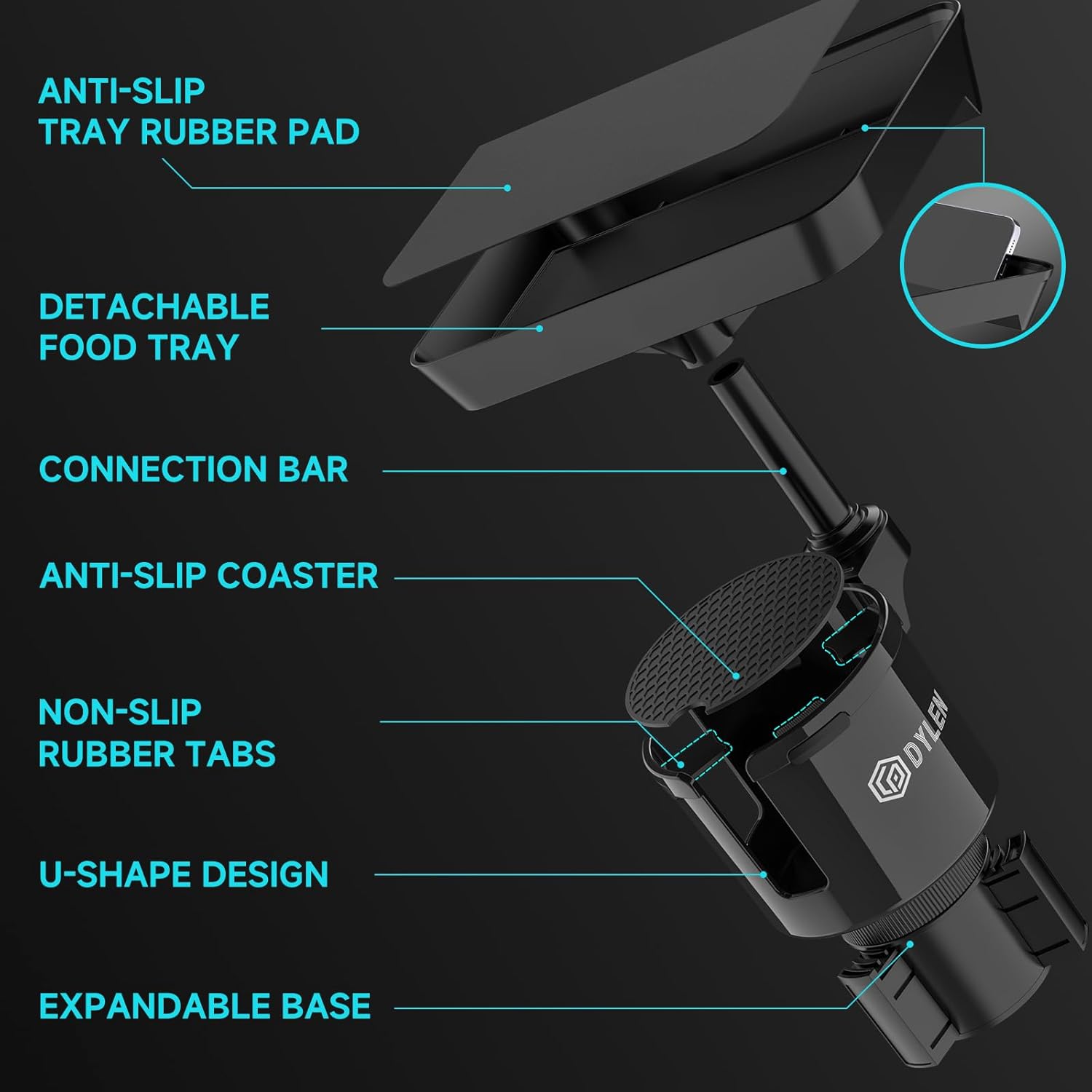 【Eating on the Go】 9.5″ car cup holder tray is large enough to hold meals. The phone slot allows you watching at the same time. DYLEN cup holder expander makes eating on the go convenient and enjoyable.