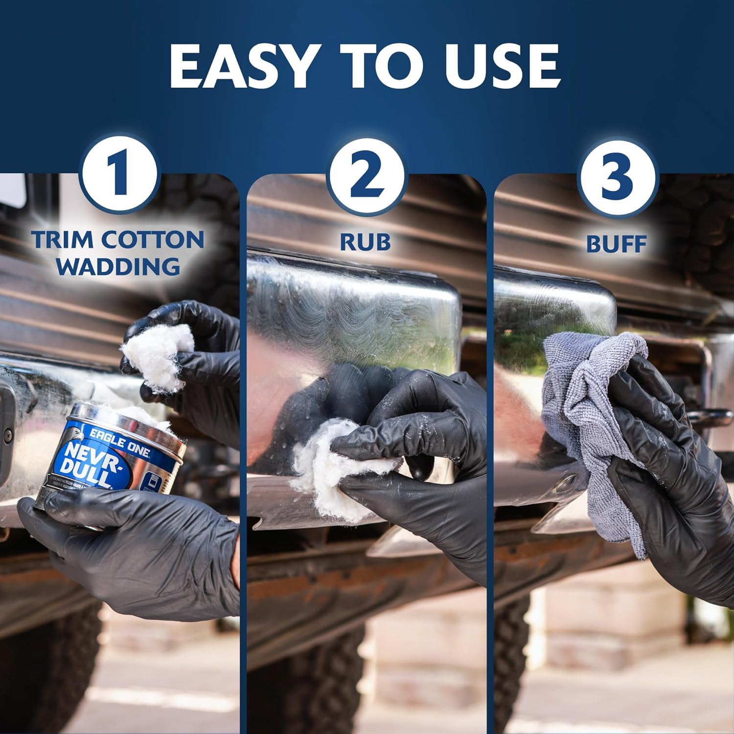 Bring back the brilliance of your metal surfaces with Eagle One Nevr-Dull Metal Wadding Polish. Each 5 oz tin contains flexible, mildly abrasive cotton wadding pads pre-loaded with powerful polish designed to remove rust, corrosion, and tar without scratching or leaving deposits. The improved formula is safe for indoor use and enclosed area, making it the perfect chrome polish to effortlessly clean, shine and protects metal surfaces in garages, bathrooms, kitchens and more. The unique rubbing compound polishes to perfection, protecting and restoring stainless steel, aluminum, and chrome to a mirror-like finish. These metal cleaning pads are great for auto care, from cars and motorcycles to RVs and boats, and works just as well on household metal, including taps, towel rails, sinks, handles, cookware, ornaments, gold, and silver. A convenient, no-scratch alternative to steel wool, each cotton wadding pad tears off easily for mess-free, targeted cleaning. Tear off what you need with no spills or no mess. Just polish and shine. Store in a cool, dry place.