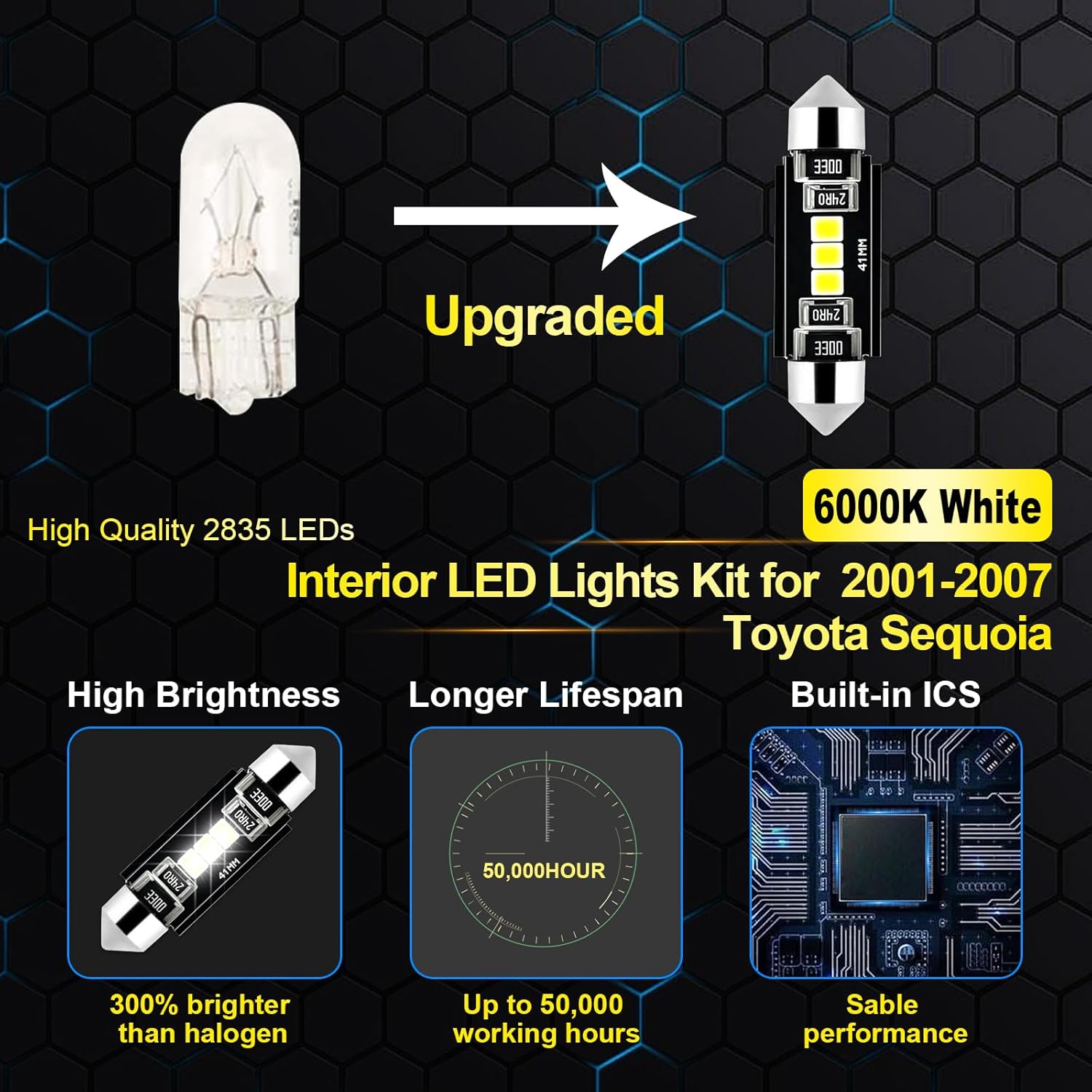Super Bright 6000K White Bulbs: Illuminate your Toyota Sequoia with high-performance 6000K white Interior Car Lights that offer superior brightness, ensuring your cabin is brightly lit without straining your eyes. These lights provide a cool white color temperature that mimics daylight, offering a crisp, clean look. Perfect for reading, searching for items, or simply enhancing the interior aesthetics of your Sequoia. Reliable, long-lasting, and designed to outshine conventional bulbs.