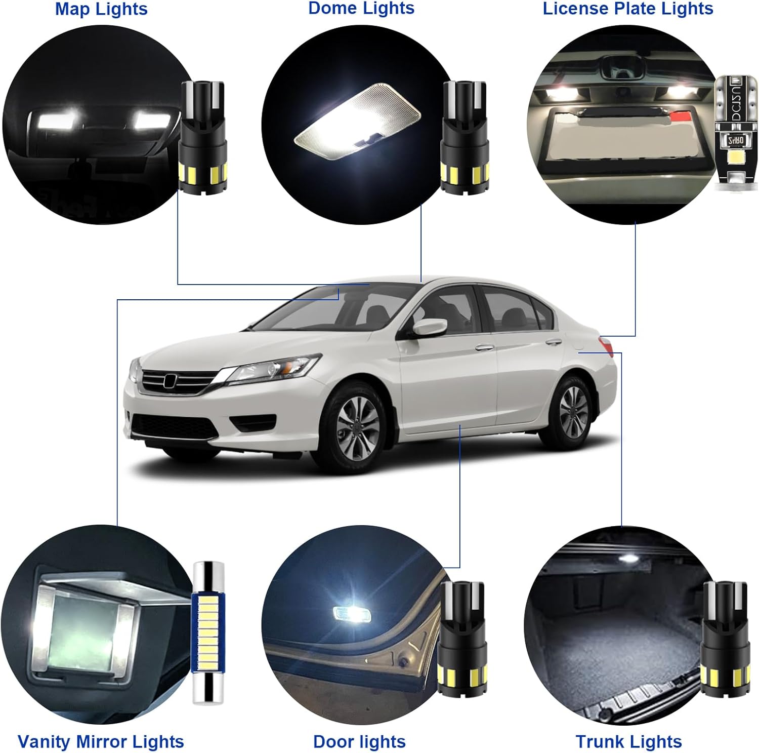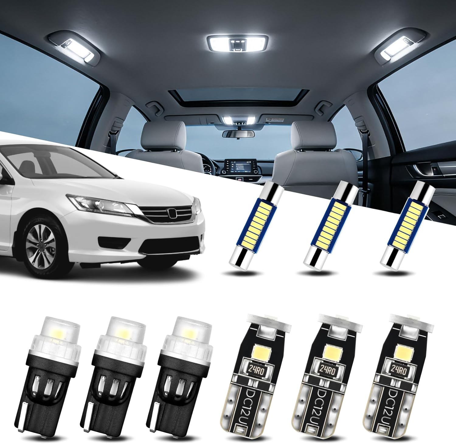 Super Bright 6000K White LED Bulbs: Illuminate your Honda Accord with high-performance 6000K white LED Interior Car Lights that offer superior brightness, ensuring your cabin is brightly lit without straining your eyes. These lights provide a cool white color temperature that mimics daylight, offering a crisp, clean look. Perfect for reading, searching for items, or simply enhancing the interior aesthetics of your Honda Accord. Reliable, long-lasting, and designed to outshine conventional bulbs.
