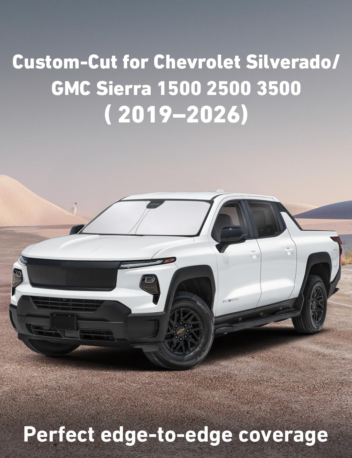 Custom Fit for Chevrolet Silverado / GMC Sierra 2019-2026 Windshield Sun Shade: Precisely designed windshield sunshade fit for Chevrolet Silverado / GMC Sierra 2019, 2020, 2021, 2022, 2023, 2024, 2025, 2026 to provide full windshield coverage with 100% light blocker.