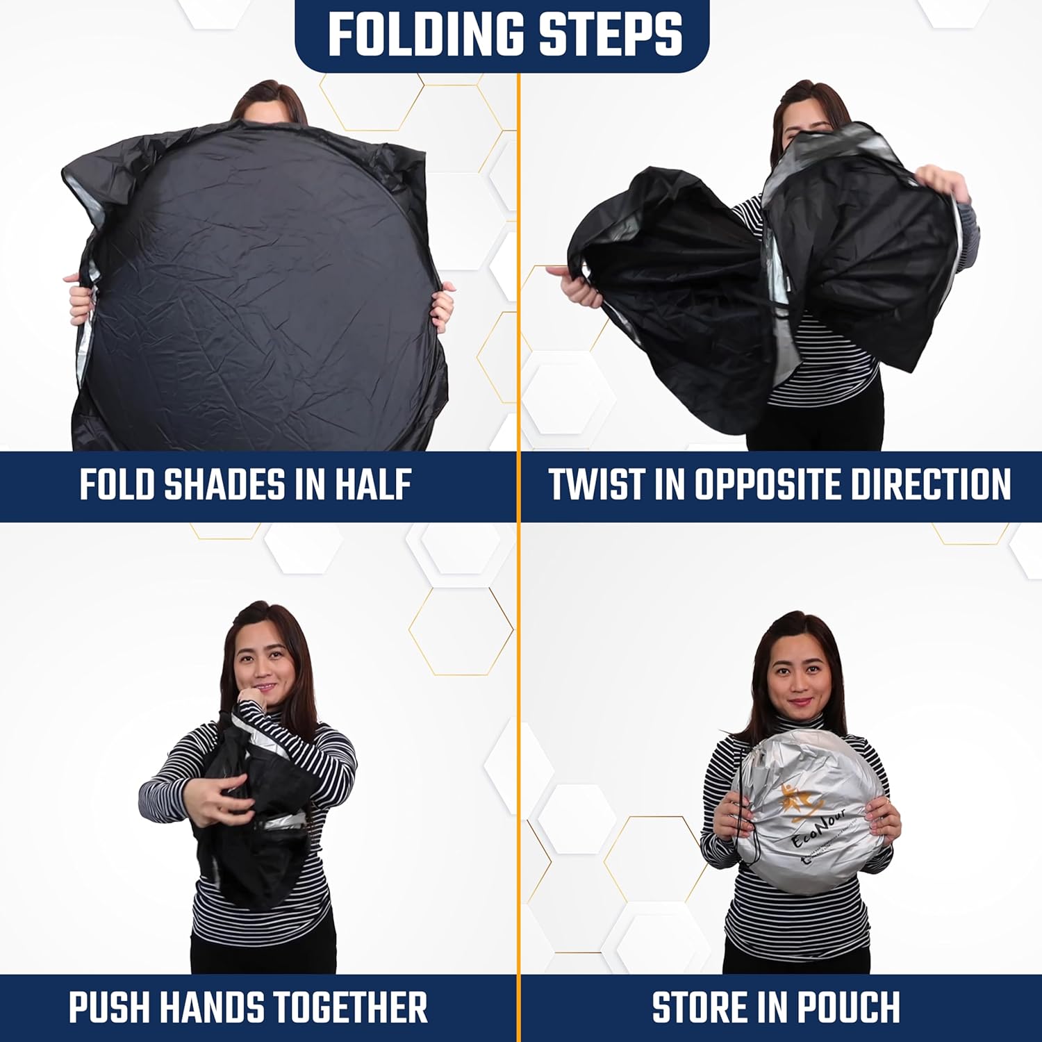 I was a little skeptical of trying these windshield sun shades since I have tried a few over the years. They were just okay, but I am really impressed on how great the EcoNour shades are! They have a mirror cut design so it fits around rear view mirrors, has high-quality reflective material, cuts down on heat considerably and comes with a handy storage bag. I’ve found it easy to put up and has functioned quite well here in FL. Definitely worth the investment!