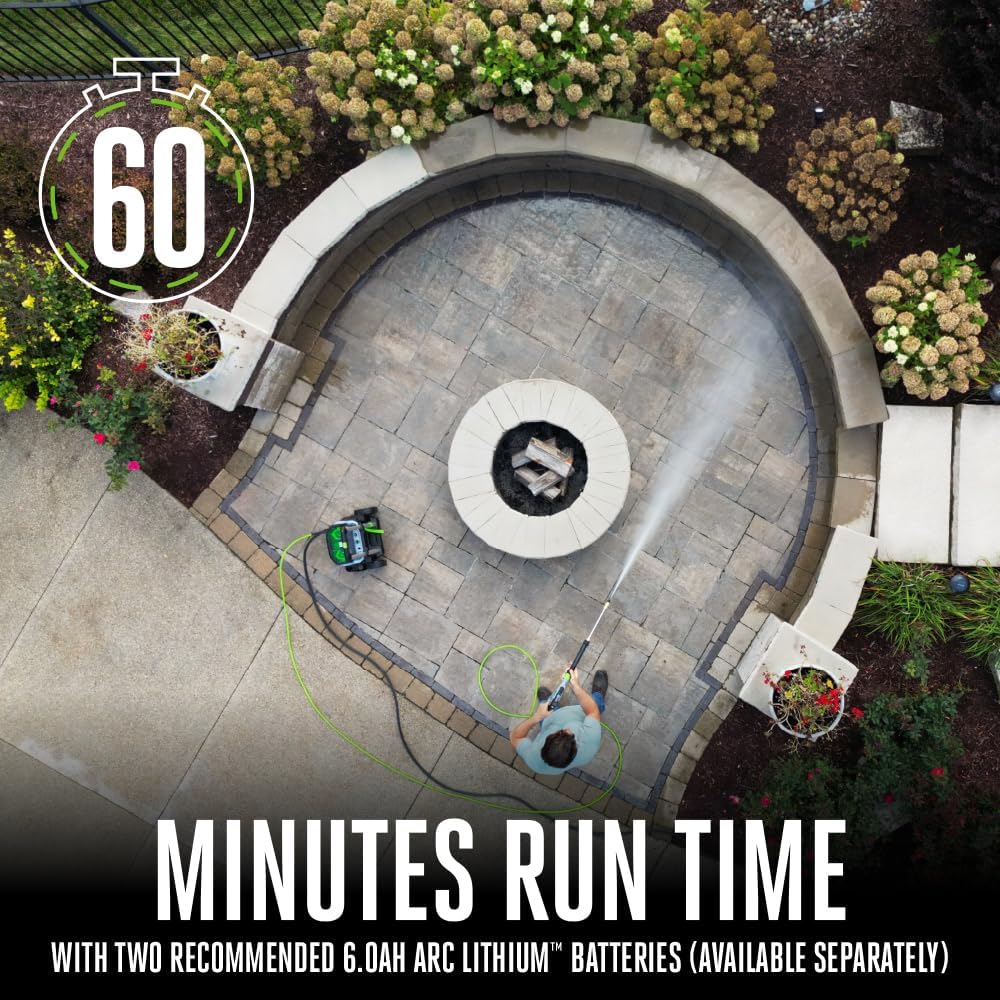 Peak Power technology combines the power of any two 56V ARC Lithium batteries to deliver up to 3200 PSI at 1.2 GPM (up to 2.0 GPM) for powerful and efficient cleaning