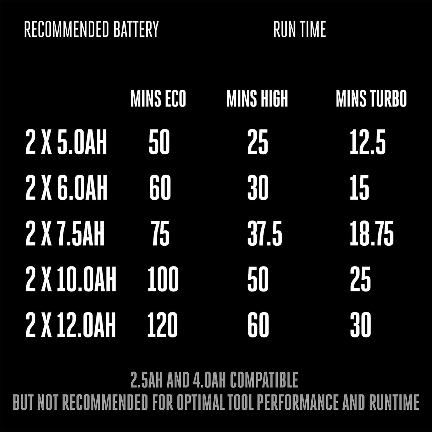 Up to 60 minutes of runtime on a single charge with two recommended 6.0Ah ARC Lithium batteries (available separately)