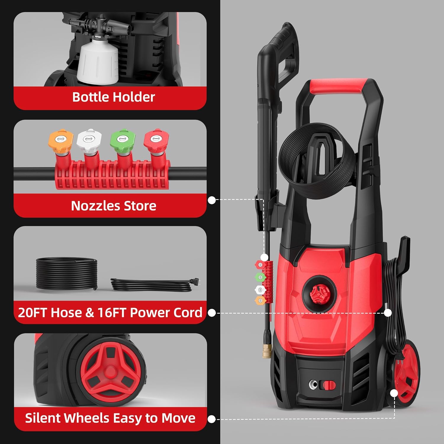 【Compact and lightweight】Our pressure washer is a breeze to store in tight spaces. The 360° swivel wheels make it easy to transport to different cleaning locations. And with dedicated storage spaces for the power cord, nozzles, spray gun, and foam cannon, you’ll never have to worry about tangles or lost parts again.
