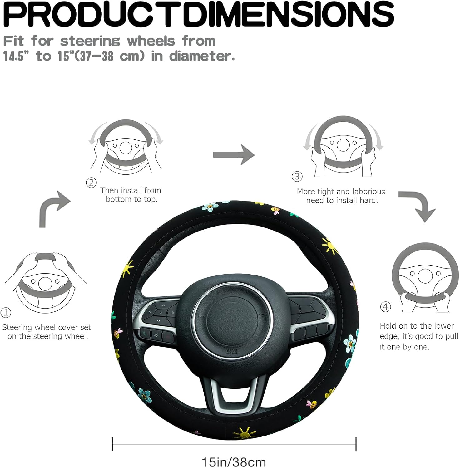 UNIVERSAL SIZE:This Embroidered Floral Bee steering wheel cover is perfect for O-shaped steering wheels with a diameter of 14.5 to 15 inches (37 to 38 cm). It fits well and protects steering wheels of this size. Most car steering wheels on the market are 15 inches in diameter, but we recommend checking our installation guide or measuring your vehicle’s steering wheel size carefully before purchasing to ensure our product is compatible with your steering wheel.