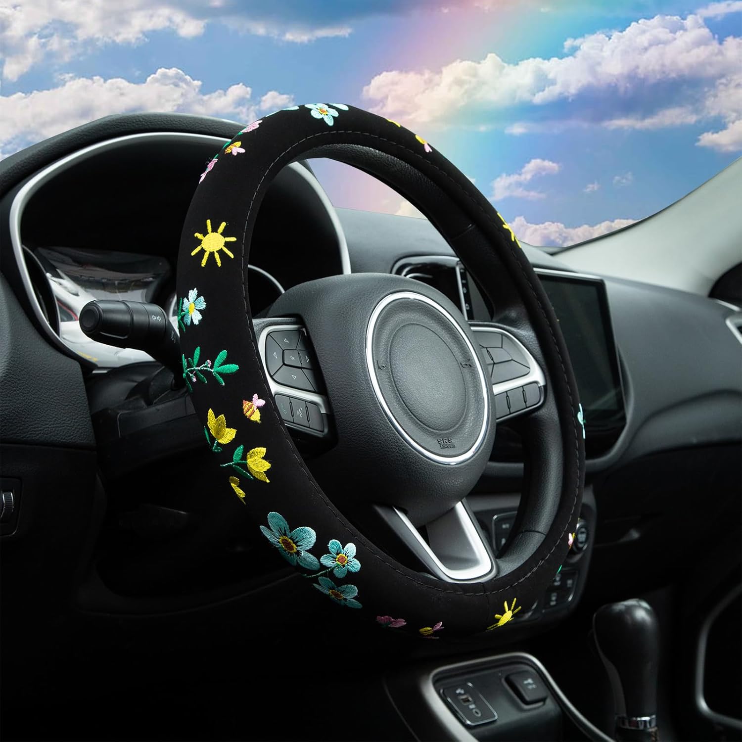 Embroidered Floral Bee Cute Black Steering Wheel Cover, Auto Anti-Slip Breathable Steering Wheel Protector,Floral Car Accessories for Women,Universal Size Fit Most Cars -15 inch