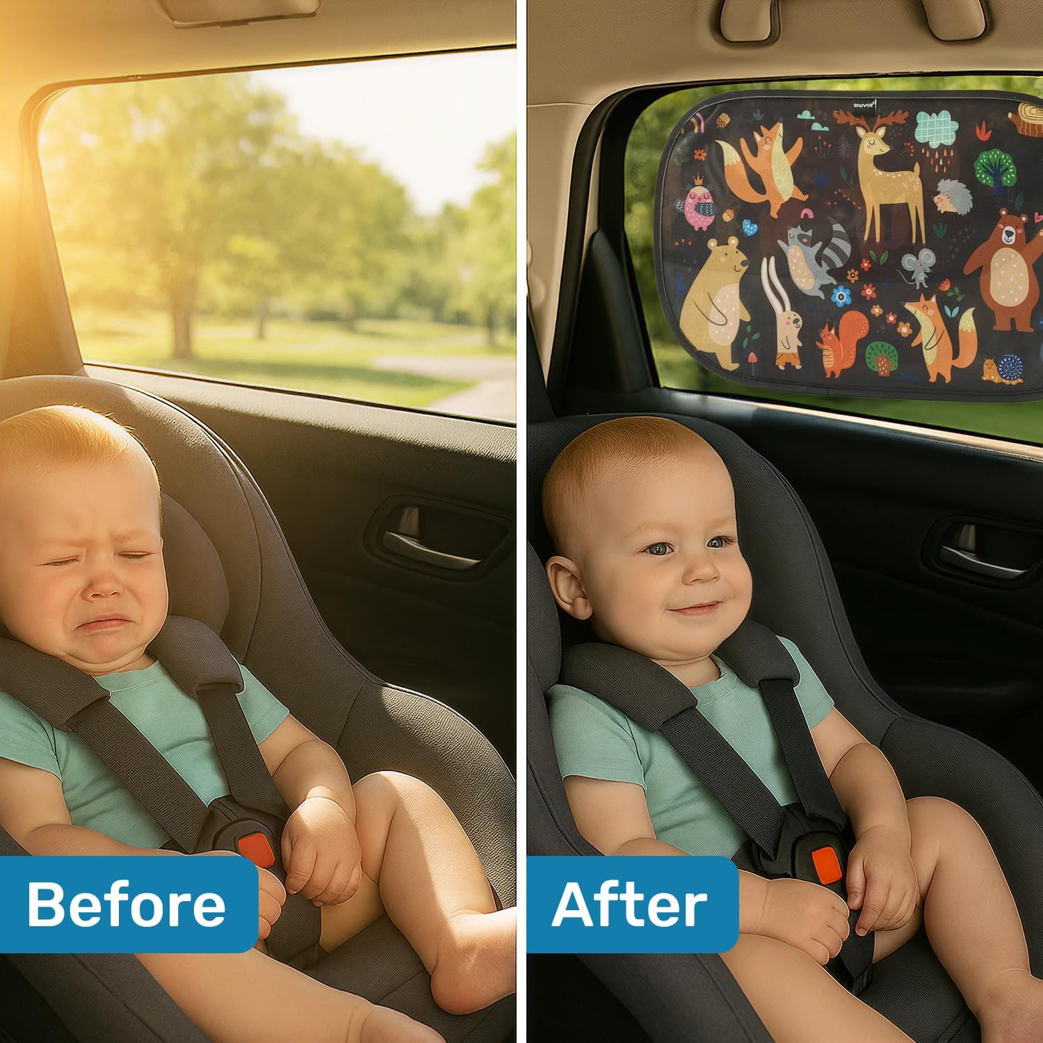 Fits Most Cars: Carton design kids car shade comes in a pack of 2 with size 21×14-inch; these Car Sun blockers are designed to fit larger car side windows of SUVs, minivans and full size cars; our sun shade is a breeze to install; Simply, place the Envoe shade on your side windows and run your hand across it