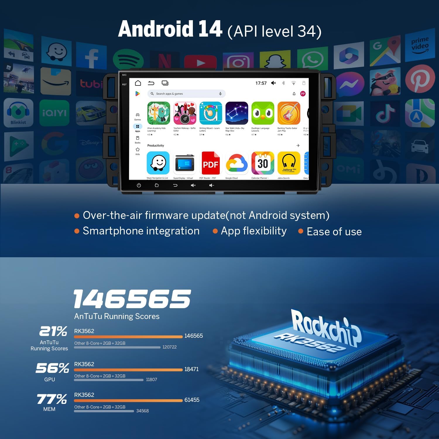 【GMAX7A upgraded Real Android 14 System】Built-in with the latest Android 14 , paired with a cutting-edge Rockchip processor for superior performance and energy efficiency, GMX7A is an upgraded version of GMAX7 outperforms conventional other car stereo with 8-core processors. Eonon offers convenient online firmware updates, you don’t need a USB stick to upgrade.3 USB ports for convenient flash drive use.