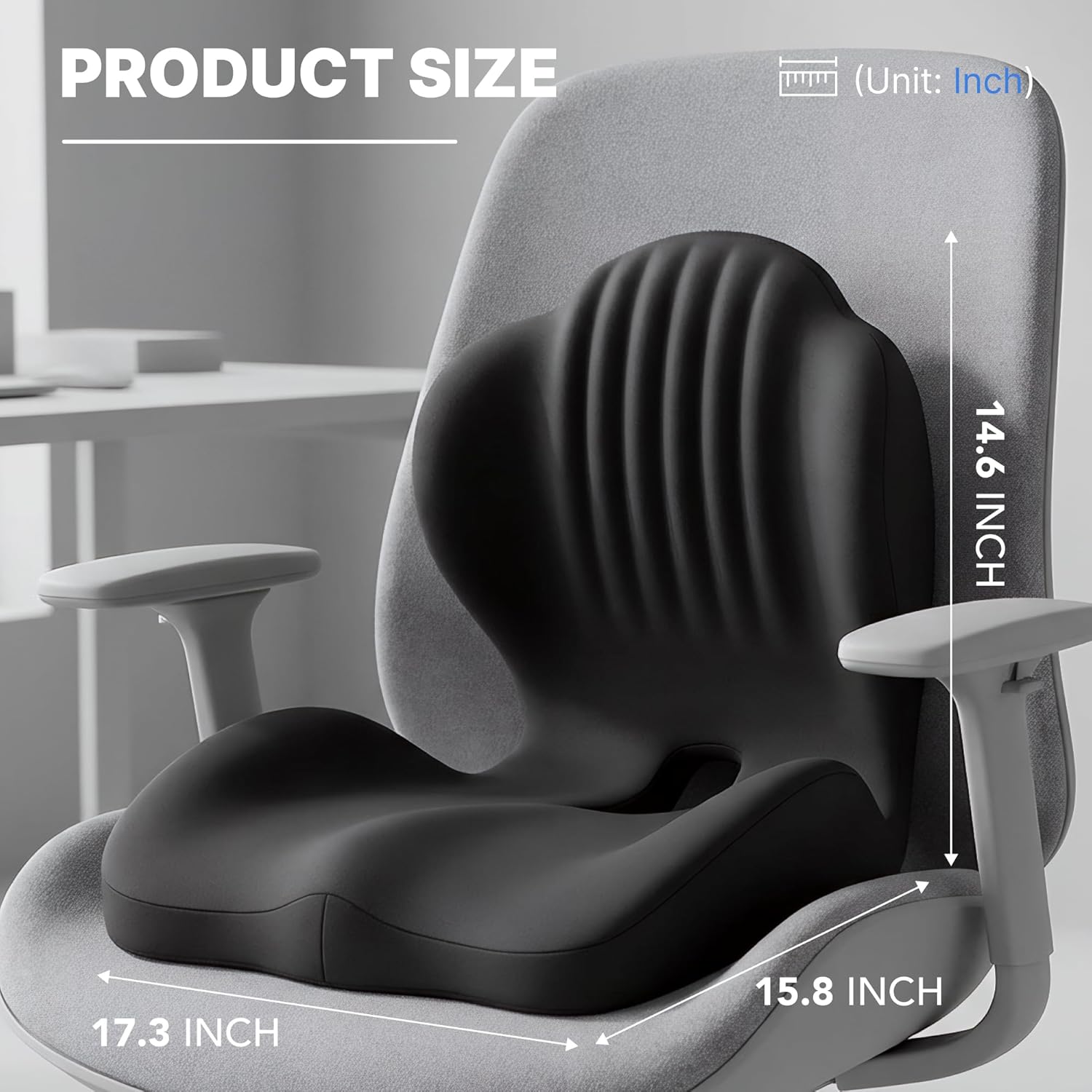 【Integrated Ergonomic Seat Cushion】: Ergonomic seat cushion with integrated lumbar support conforms to the curves of the buttocks, and its universal size (17.32 × 15.75 × 14.57 inches) fits various chairs, effectively relieving lower back pain and sciatic nerve discomfort caused by prolonged sitting