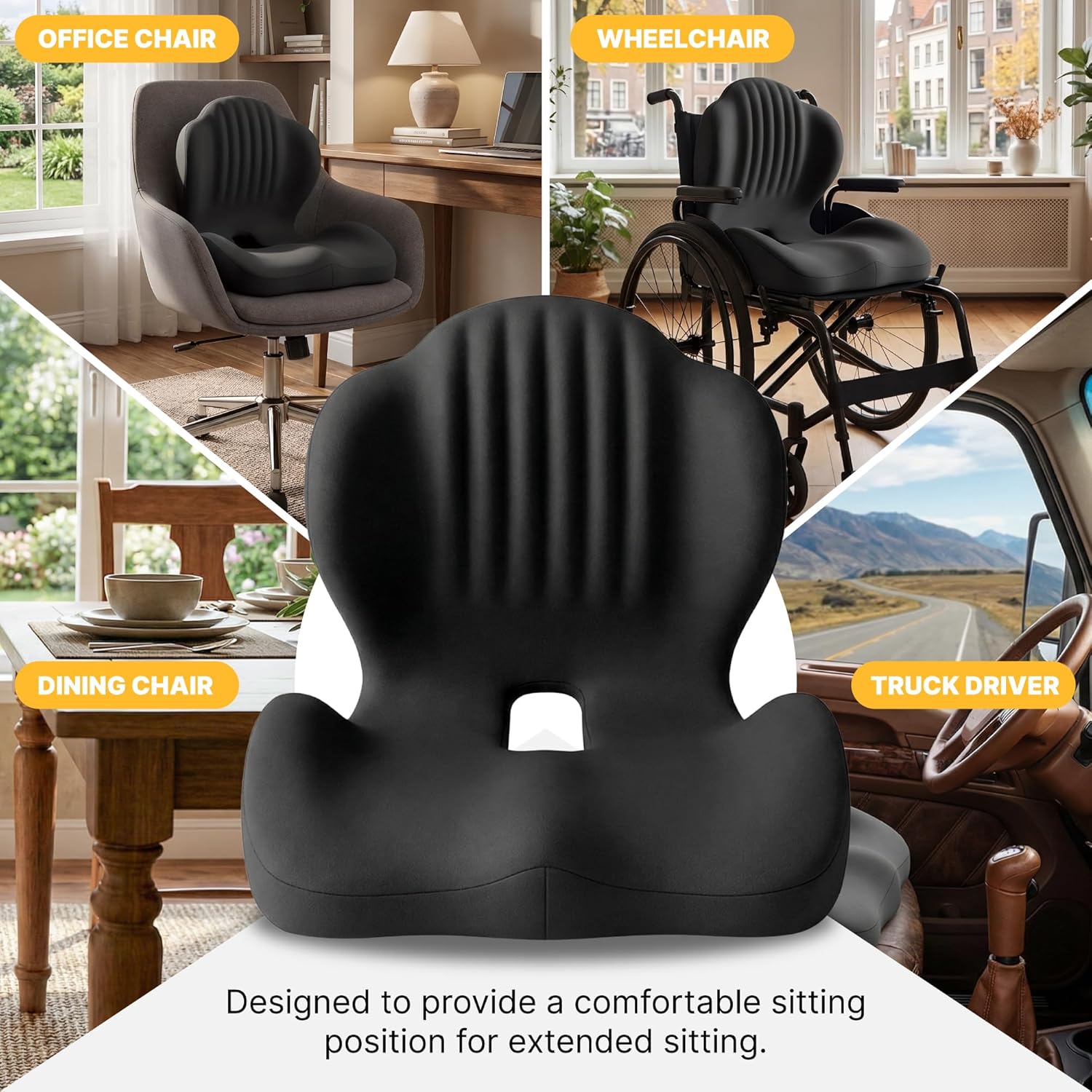 This seat cushion is designed for prolonged sitting, with a dual-ergonomic structure that provides lumbar support and a tailbone groove to reduce lower back strain and alleviate sitting fatigue.