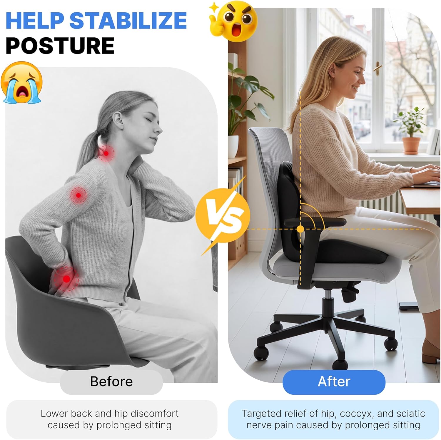 【High-density Memory Foam】: High-density memory foam has excellent elasticity and maintains its shape even after prolonged use. It perfectly conforms to the natural curve of the spine, and the bottom has an Non-slip design, providing stable support and pressure relief for the lower back and hips