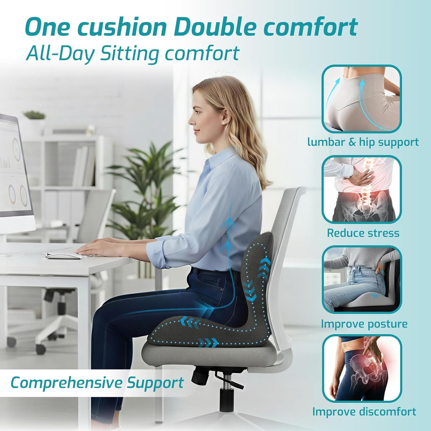 One Cushion, Double the Comfort: Experience unparalleled comfort with our unique one-piece design that seamlessly combines lumbar support and seat cushioning. This innovative design provides full-body support, effectively alleviating discomfort and chronic pain caused by prolonged sitting. Say goodbye to hip, lower back pain, and sciatica, and enjoy all-day comfort