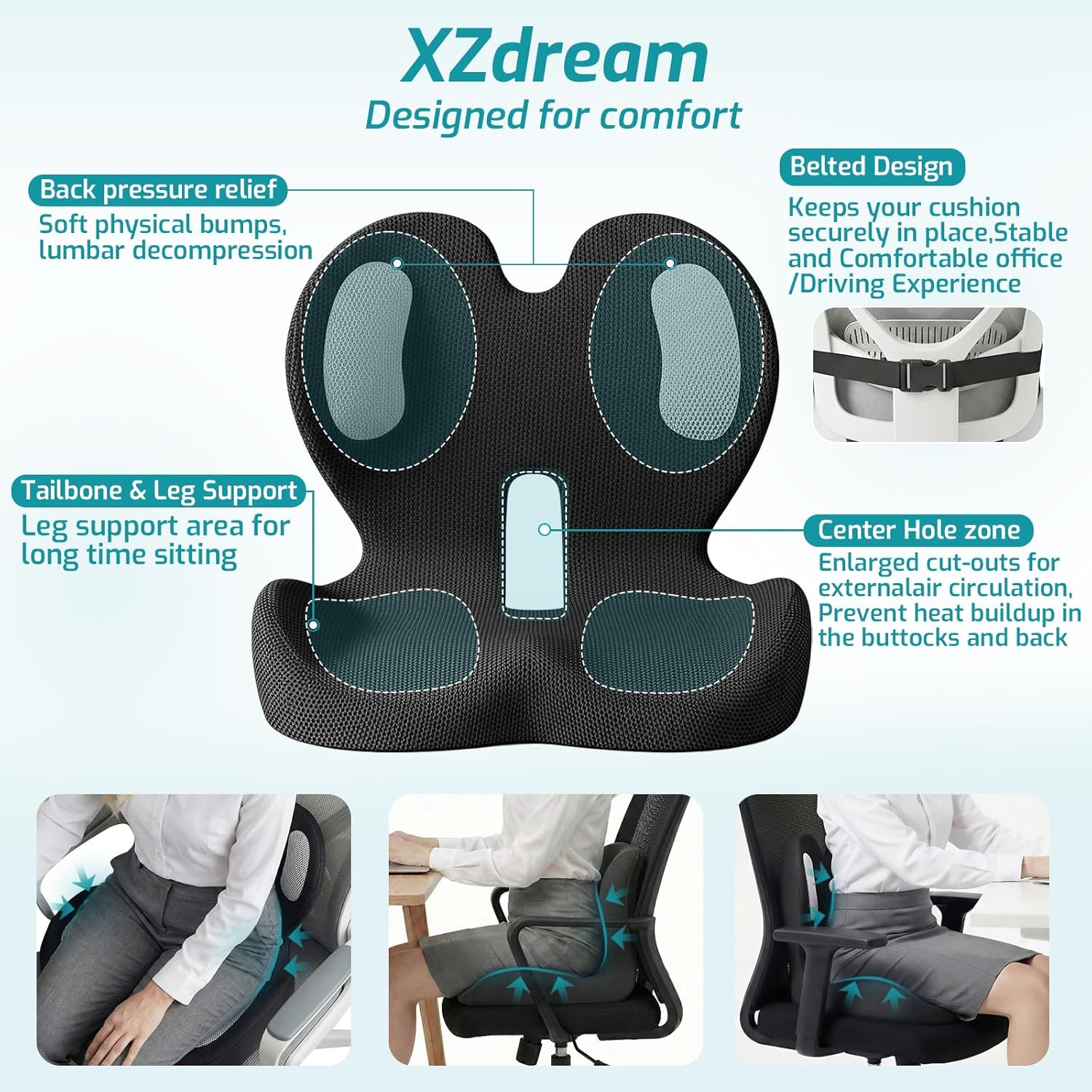 So the XZdream Seat Cushion,Office Chair Cushion with Lumbar Support Pillow is a dream come true! The cushion arrived and has been used everyday. The size is perfect and fits well, without being too narrow and is easy to use. It is a good wide width. The strap allows you to buckle it to the chair to prevent sliding. Very easy to adjust if needed. This cushion really helps provide excellent relief for long days at the computer. My lower back and my sciatica feel so much better using this cushion. It also wipes clean so clean up is easy. The material is dense and good quality, making it hold it’s shape very well. Hands down the most comfortable cushion I have purchased. Great value!
